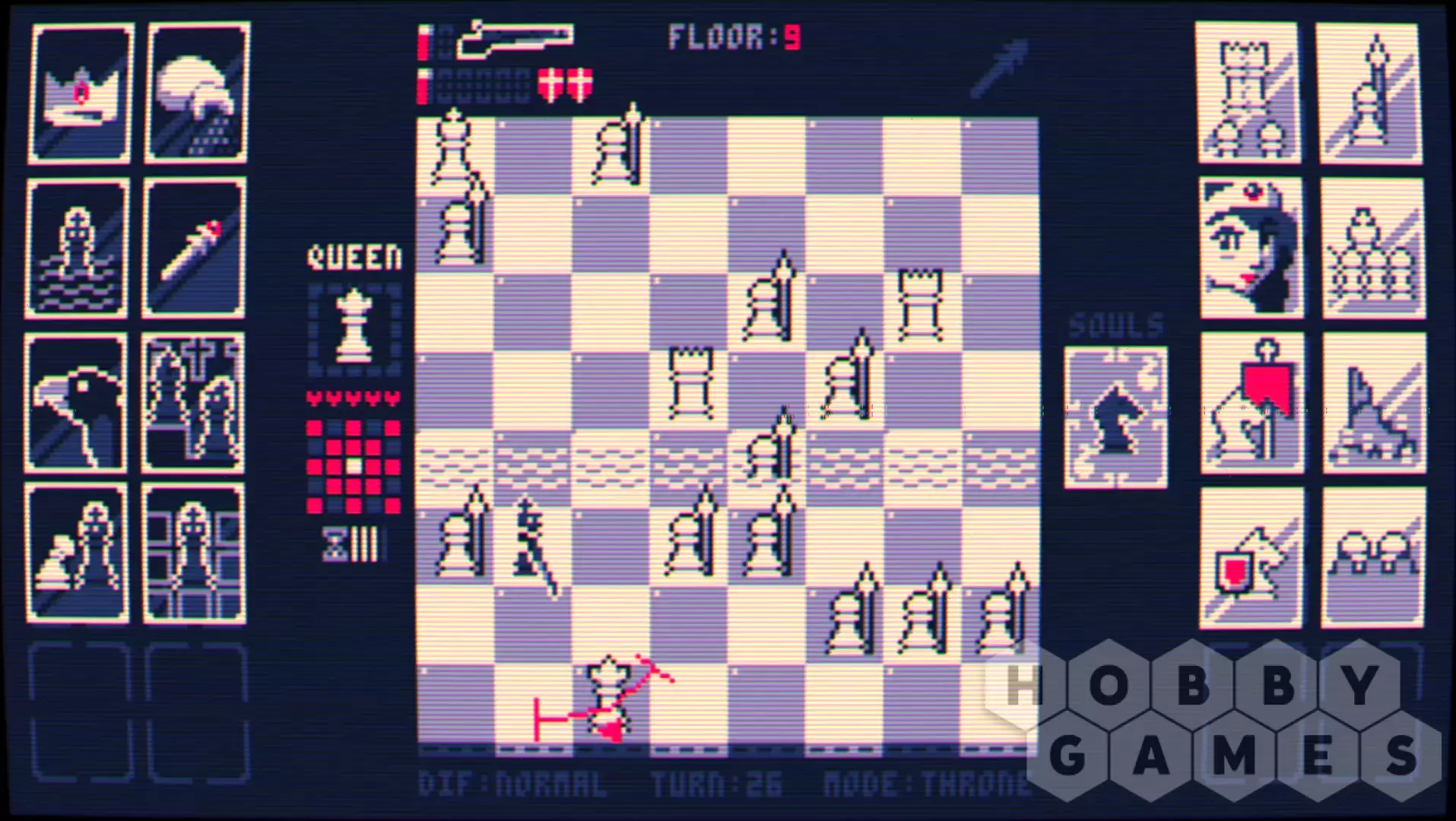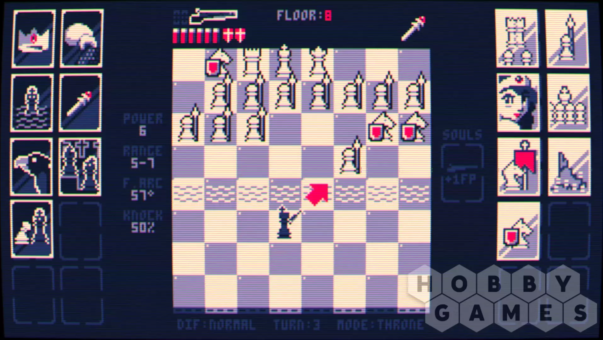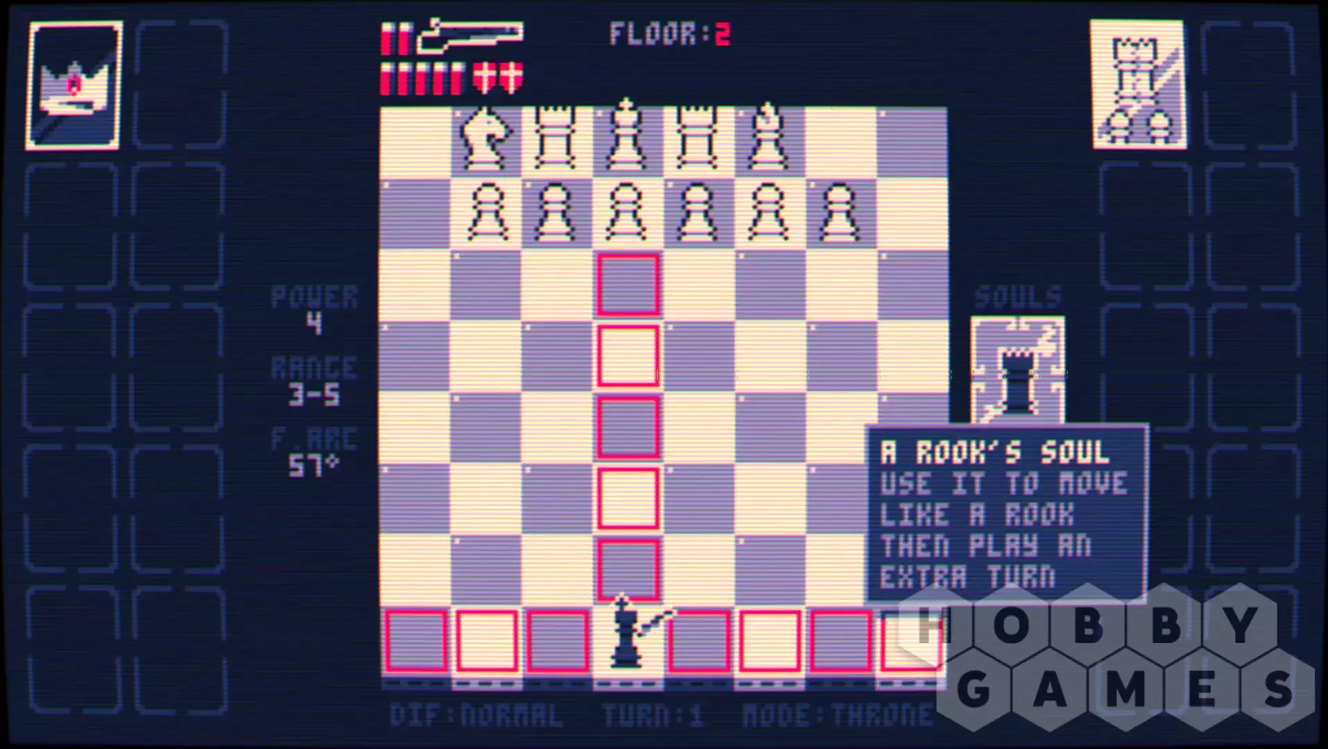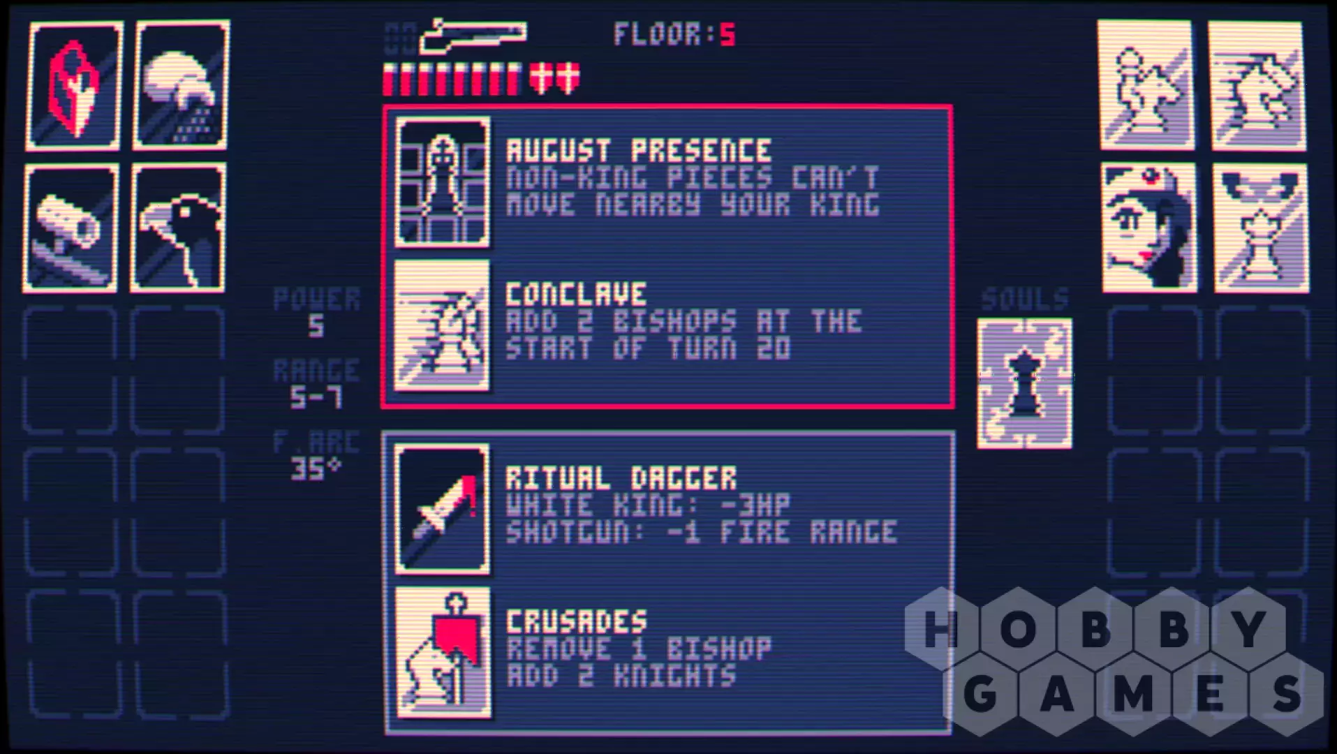 На каждом ходу король может двигаться или стрелять по фигурам. После выстрела он тратит действие на перезарядку дробовика. Не дайте поставить вам шах и мат и убейте вражеского короля, чтобы пройти этаж. После каждого этажа вы сможете выбрать между двумя случайными парами карт: одна улучшает вашего короля, другая — сторону врага. Выбирайте мудро, зачищайте этажи, и, возможно, вам удастся отвоевать свое королевство.