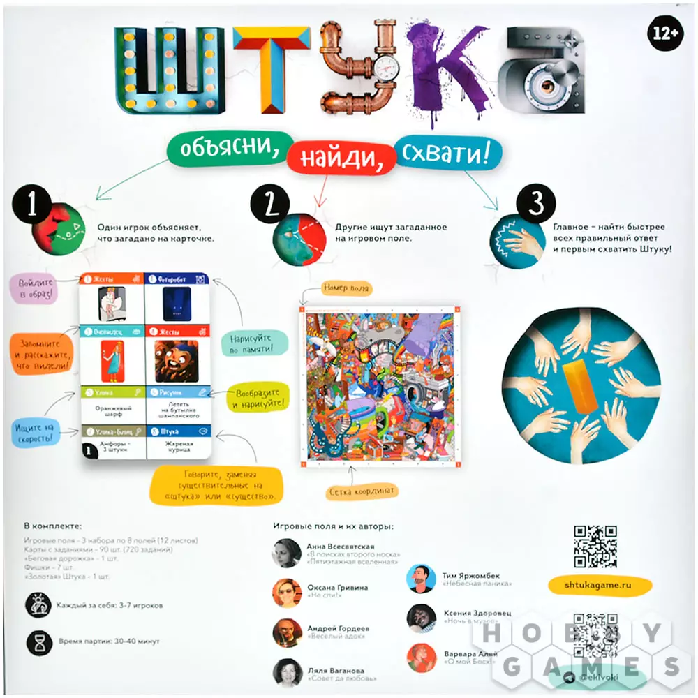 "Штука" – это настольная игра на внимание и ловкость формата "объясни-покажи". Один игрок, ведущий, будет тем или иным способом (словами, рисунком, жестами и т.д.) объяснять слово с карточки задания. Остальные же должны на скорость понять, о чём идёт речь, а затем найти загаданный предмет на игровом поле – завораживающих композициях, с любовью созданных художниками и иллюстраторами. Не забудьте сперва схватить золотую Штуку – это даст вам право ответить, а также подтвердит, что вы были быстрее своих соперников. Если вы дали правильный ответ, продвиньтесь по "беговой дорожке" для фишек вперёд, а если ошиблись, вернитесь назад – в наказание за свою нетерпеливость и поспешность!