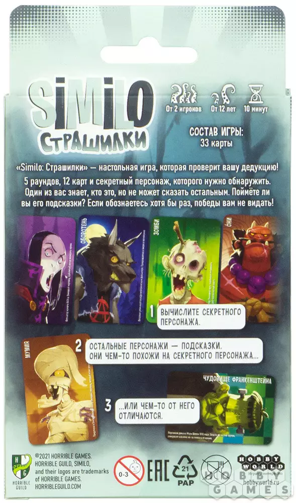 Горячих12.11.2021 21:48Если вы любите суперпростые правила, если у вас нет времени играть в доолгие сложные игры и вы любите страшил и монстров - это игра для вас. Цена недорогая, правила обьясняются за 1 минуту, партия длится минут 10. Игра на чистую логику и фантазию. Мы с 7-летним сыном первый раз весь вечер играли, но некоторые картинки и правда жутковатые. Краткие объяснения со словами "человечина", "маньяк", "истязания" имеются, так что лучше играть с детьми 10+, а то впечатлительных много. Мы с сыном в восторге, но вот мужу и бабушке не понравилось. Так что выбирать вам. Ждём локализации, где будут карточки Истории и Сказки.