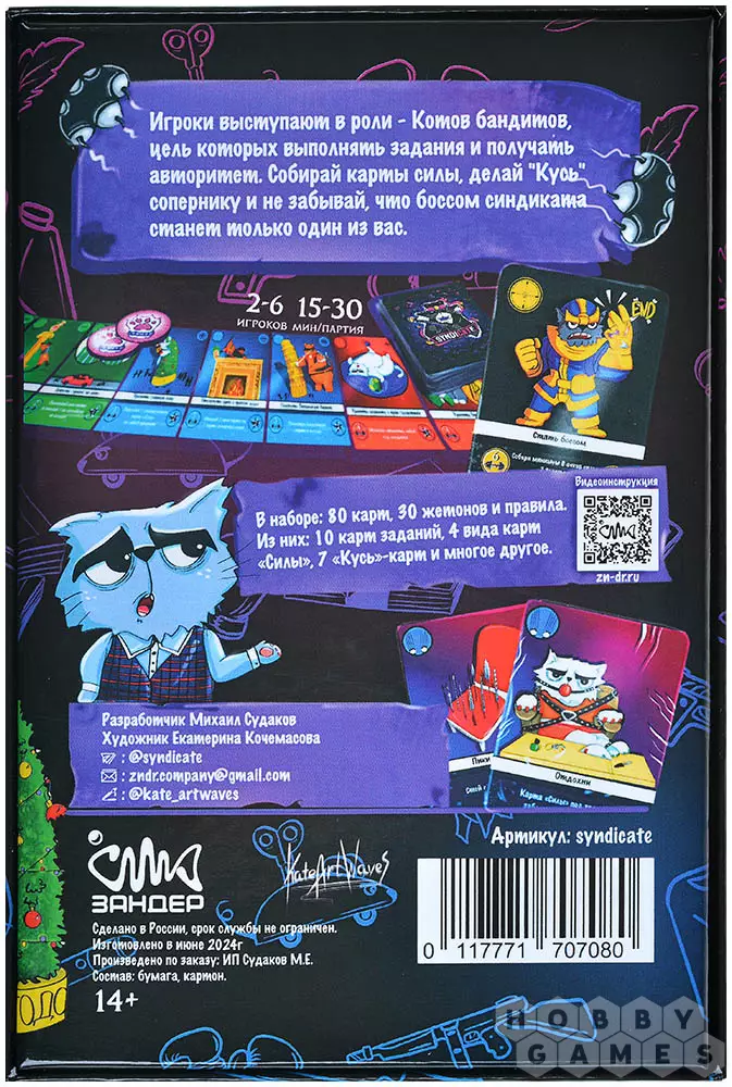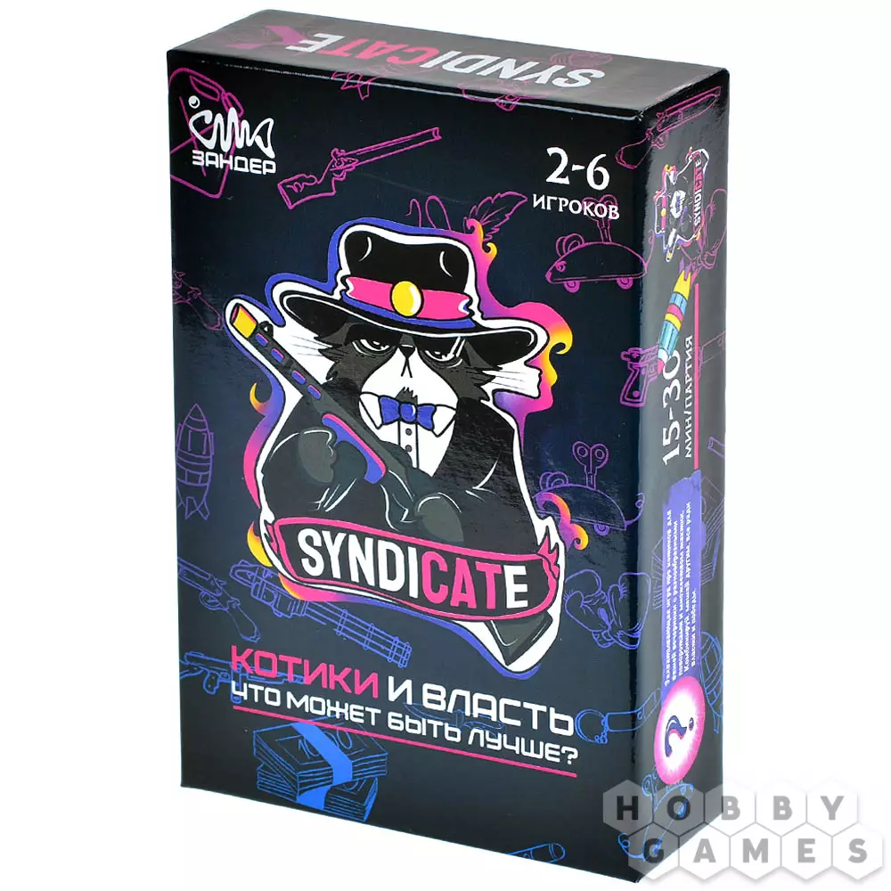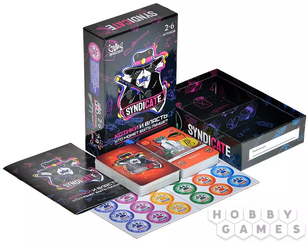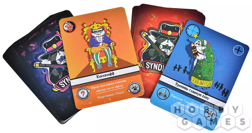 "SyndiCate: Котики и власть" – это весёлая карточная игра с простыми правилами, для победы в которой вы в роли котов-бандитов должны заработать больше 5 очков авторитета за выполненные задания. Для этих целей вам нужно собирать карты "Силы".