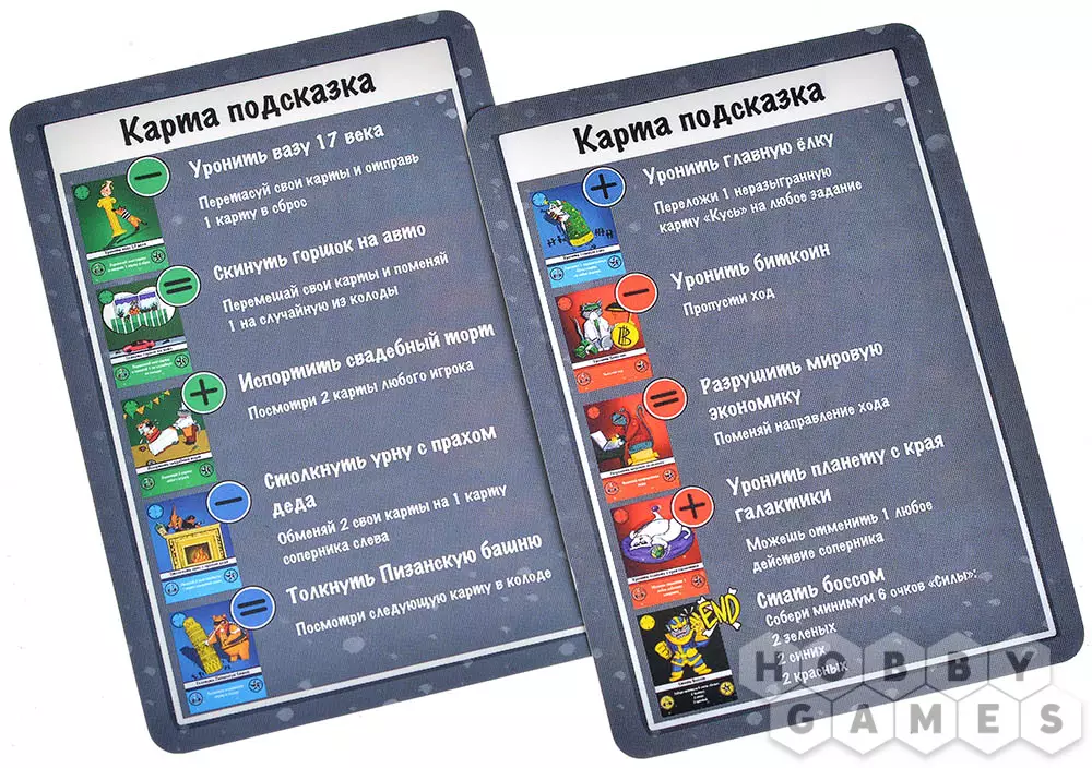 В центре стола слева направо выкладываются карты заданий нескольких цветов: чем дальше задание от левого края, тем больше очков авторитета оно принесёт, но тем сложнее будет его выполнить. Заходя в тёмный переулок всё дальше и дальше становится всё опаснее, не так ли? Вначале игры каждый кот получает 5 карты "Силы". Они имеют те же цвета, что и карты заданий, поэтому, чтобы выполнить задание зелёного цвета, нужно разыграть на него зелёные карты "Силы". Они обладают самыми разными эффектами: одни позволяют вам отжать действия у противников, другие позволяют сбросить свои карты и набрать новые. Задания же не только приносят авторитет, но и обладают дополнительными свойствами, которые вы можете применить в разный момент игры. Уважение уважением, а награду за выполненное задание никто не отменял! Применяйте различные тактики, путайте противникам карты, и взберитесь на вершину успеха кошачьего синдиката!