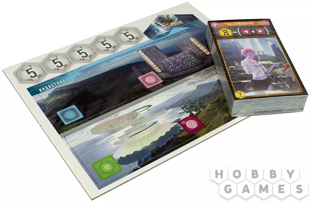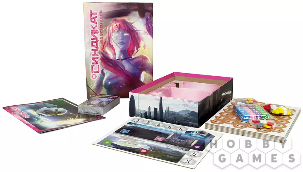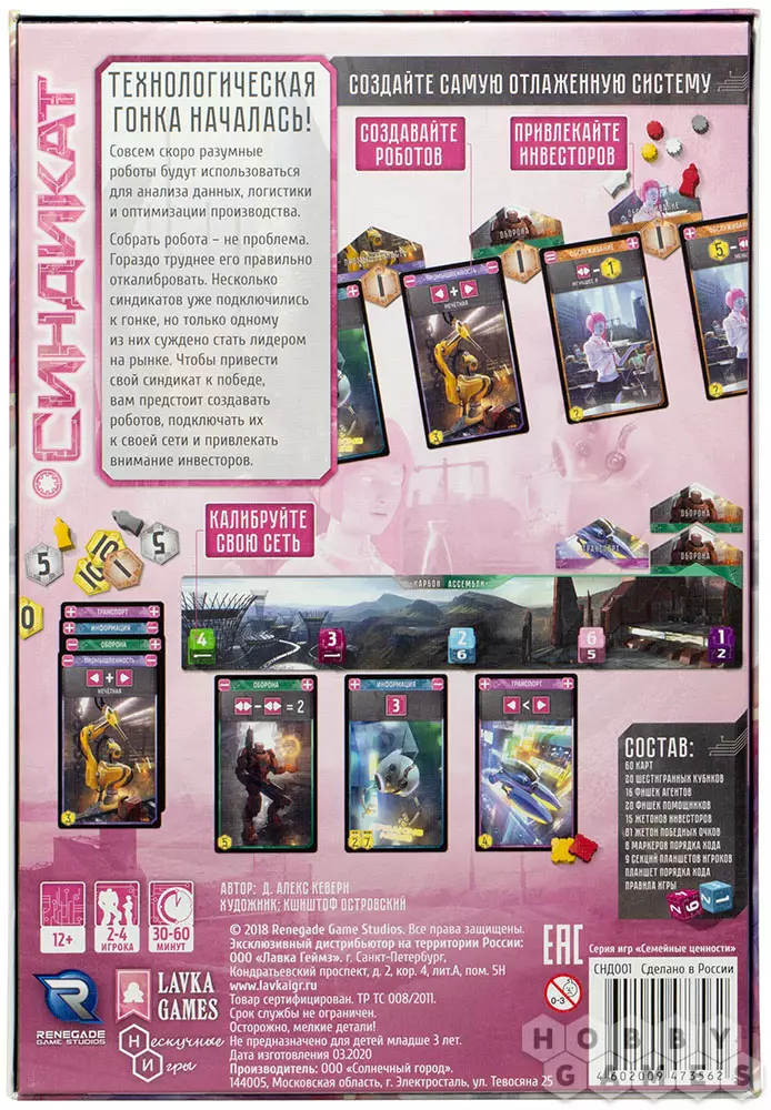 Игра продолжается 3 раунда, в течение которых вы будете бросать кубики и выкладывать их на планшете своего синдиката. Звучит просто, но за этой незамысловатой механикой прячется настоящая битва ума: нужно грамотно подбирать и сочетать кубы и их значения с имеющимися у вас картами роботов, "подкручивать" кубики, использовать фишки помощников, влияющие на синдикаты и их отношение к той или иной корпорации. Покупайте роботов, привлекайте инвесторов и стройте самую влиятельную корпорацию в этом сверкающем металлом мире будущего!