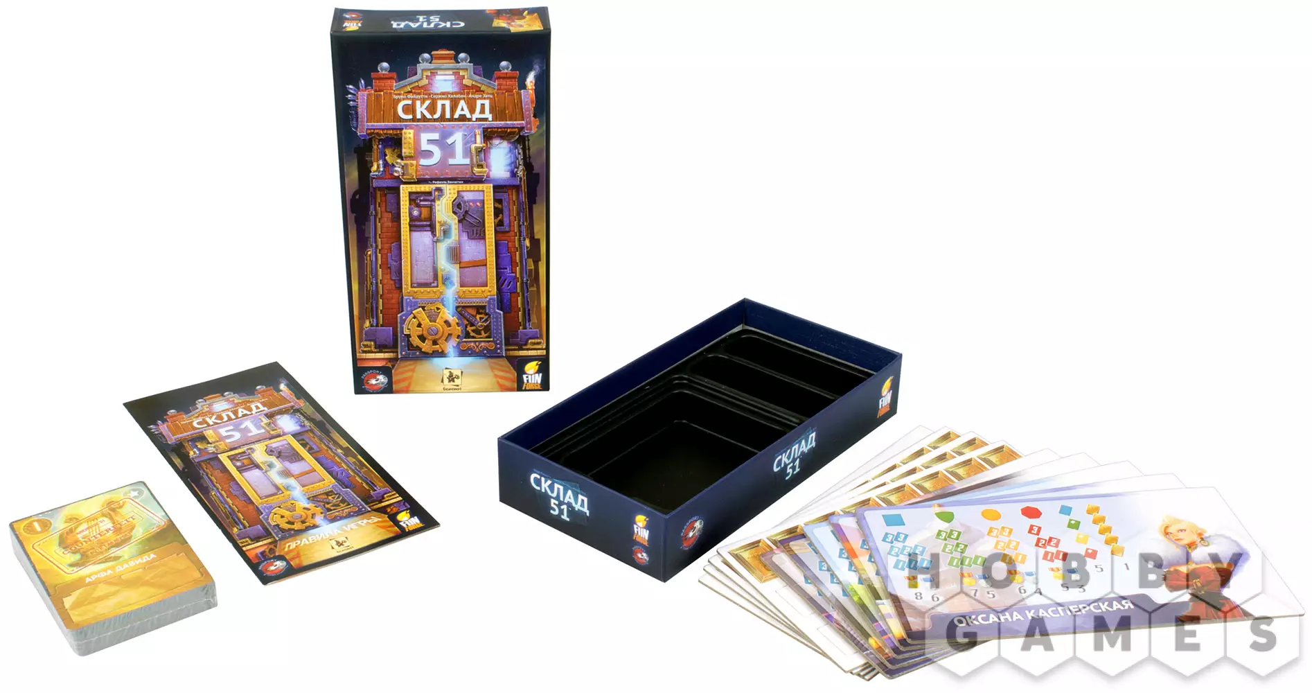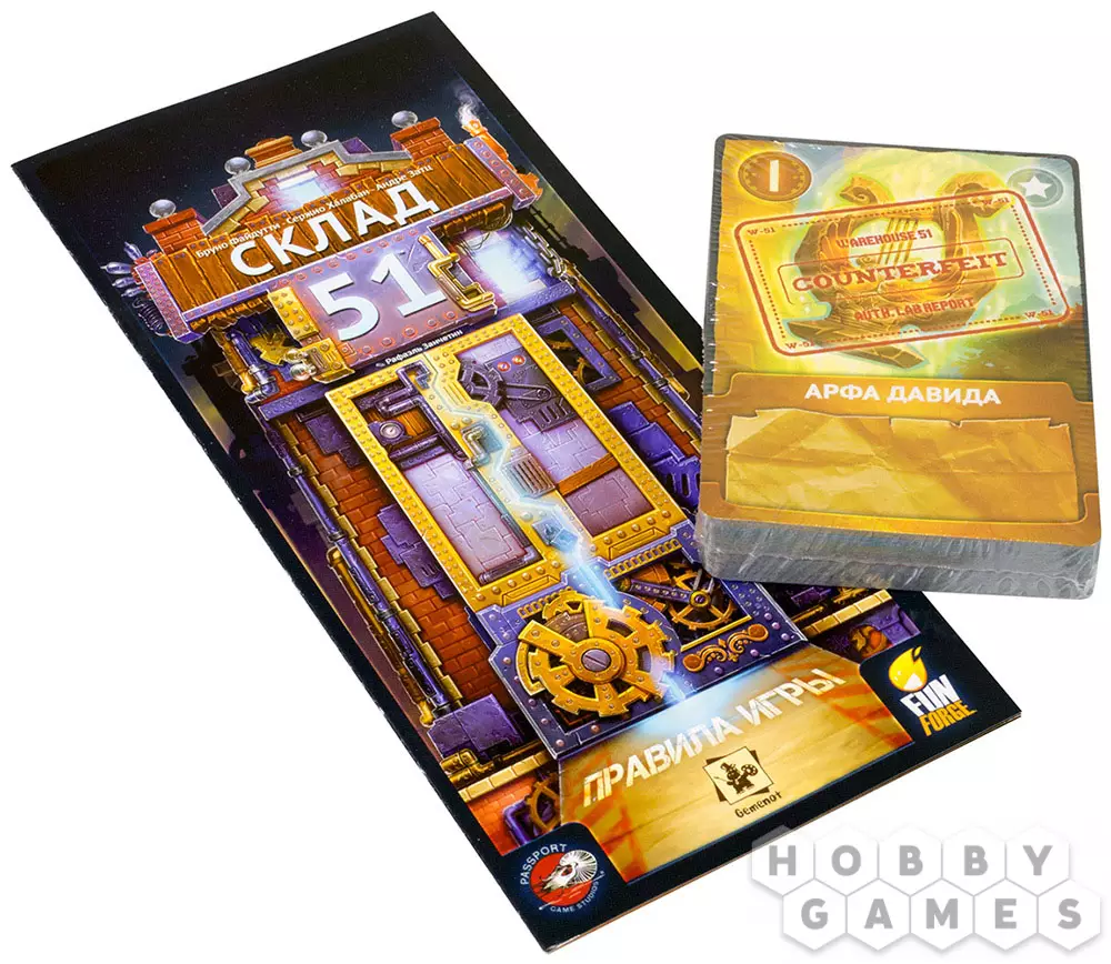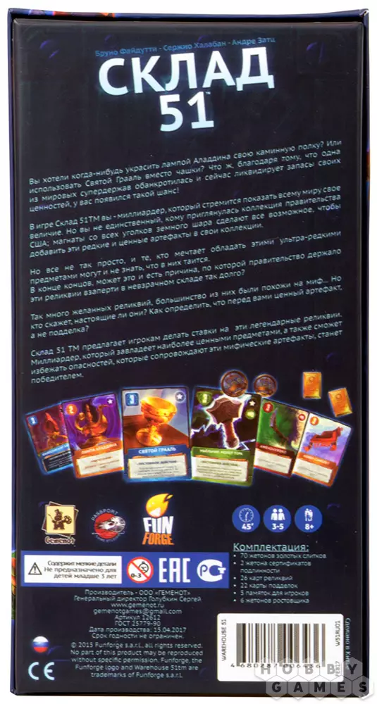 В настольной игре "Склад 51" игрокам предстоит соперничать друг с другом, пытаясь заполучить в свою коллекцию лучшие экземпляры и сокровища. Однако, будьте внимательнее, ведь ваши приобретения вполне могут быть проклятыми или оказаться подделкой. Собирая ценные сеты из карт, вам необходимо набрать максимальное количество очков. Эта игра придётся по вкусу поклонникам игр-аукционов с элементами торговли и блефа.