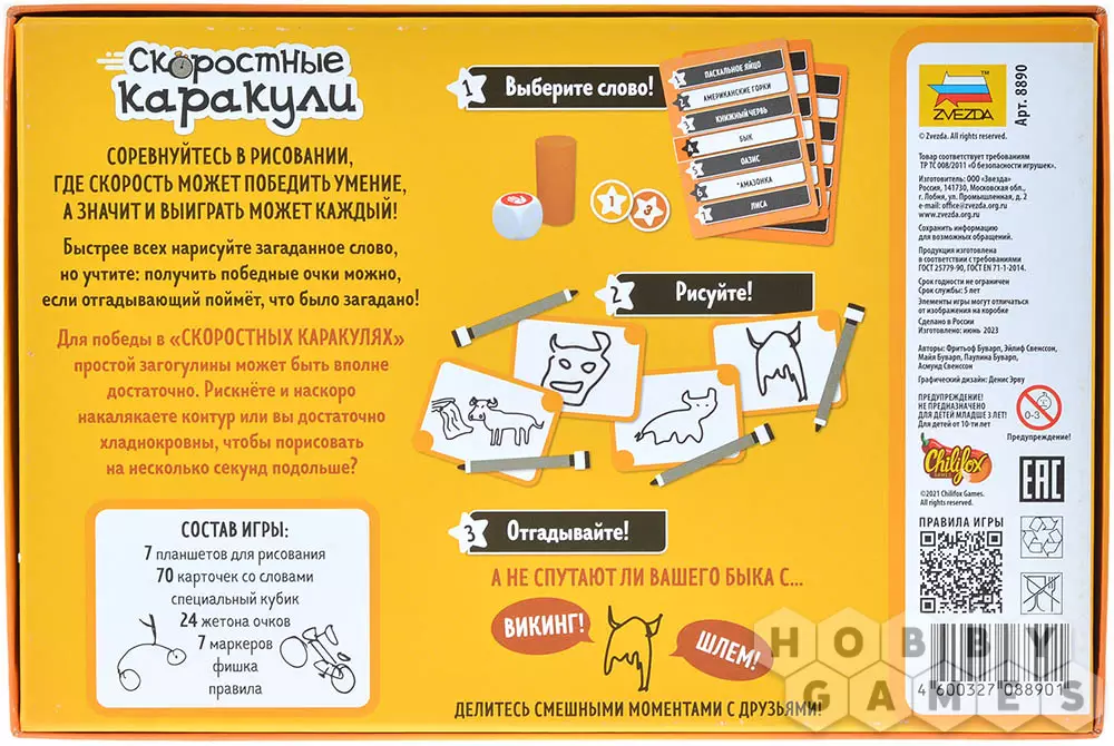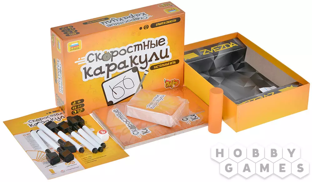 "Скоростные каракули" – весёлая настолка на ассоциации для шумной компании, в которой вам предстоит рисовать как можно быстрее! В этой игре качество рисунка не имеет значения, важна только скорость! А победить можно, даже нарисовав простую загогулину.