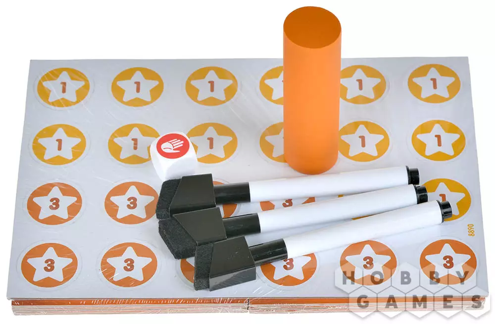 Каждый раунд один из игроков становится отгадывающим, а остальные – художниками. Отгадывающий закрывает глаза, а художники берут из колоды карту, на которой написаны семь разных слов под номерами от 1 до 7. Отгадывающий называет цифру, художники знакомятся со словом и приступают творить! Кстати, карта со словами переворачивается лицевой стороной вниз, а отгадывающий всё ещё сидит с закрытыми глазами. Художник, первым закончивший свой шедевр, переворачивает планшет лицом вниз и берёт с центра стола фишку. Художник, закончивший вторым, хватает со стола кубик и бросает его до тех пор, пока на нём не выпадёт символ "СТОП". Как только выпадет символ, художник объявляет об этом остальным, и они заканчивают рисование.