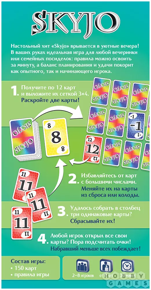 Skyjo – идеальная настольная игра для весёлых вечеров! Простые правила, которые можно освоить за минуту, и увлекательный баланс стратегии и удачи покорят как опытных, так и начинающих игроков.