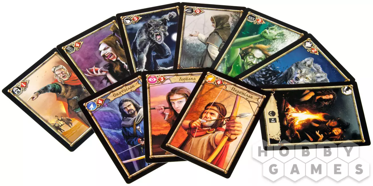 В начале игры на рукеу каждого есть весь набор своих героев (все шесть карт), а также пять случайных карт супостатов из одноименной колоды. На столе лежат и ждут своего освобождения области – четыре карточки для игры вдвоем-втроем;или пять карточек для игры вчетвером-впятером. Каждая из них приносит разное количество победных очков за свое освобождение и может как усилить чью-либо силу, так и запретить использование каких-либо свойств. В Славике все игроки ходят по очереди, передавая ход соседу слева– сей славный обычай в большинстве настольных игр сохранен и по ныне.