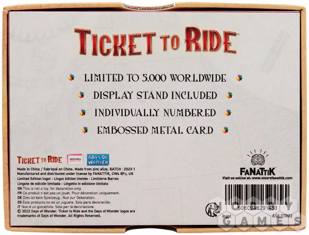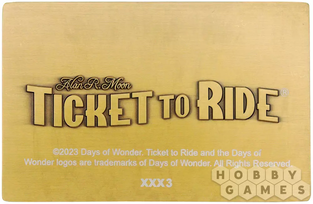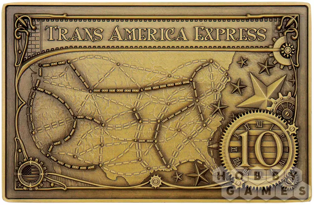Ваша империя заслуживает достойной награды! Получите слиток Trans America Express и добавьте к своим достижениям 10 заветных очков за самый длинный непрерывный маршрут. Этот металлический слиток – материальное воплощение вашего железнодорожного триумфа в игре Ticket to Ride. Исполненный с ювелирным вниманием к деталям, он украшен изысканным рельефным тиснением. Тираж ограничен всего 5 000 экземплярами по всему миру, а уникальный номер делает слиток по-настоящему ценной находкой для коллекционеров. Стильная презентационная коробка с подставкой позволит ему занять почётное место в вашей коллекции как символ очередного покорённого маршрута!