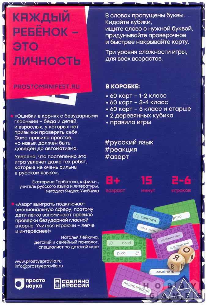 Русский язык поистине многогранен. Многие иностранцы считают его одним из самых сложных для изучения. Да что там иностранцы? Многие носители языка даже и не подозревают о существовании некоторых правил! И порой, увы, самых простых. Настольная игра "Словодыр" проверит ваши базовые знания орфографии, поможет юным игрокам освоить одно из основных правил русского языка, а также проверит на внимательность. Бросайте кубики, находите на карточках слова с подходящими пропущенными буквами, докажите, что пропущена именно эта буква и заберите карточку себе! Игрок, собравший наибольшее количество карт становится победителем.