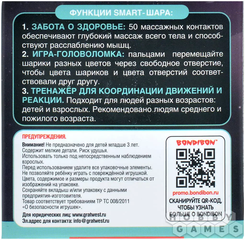 Игра-головоломка "Smart шар" – это хороший тренажёр для детей. Она хорошо развивает мелкую моторику, а также способствует пониманию цветов. Для решения головоломки нужно проталкивать маленькие выступающие шарики внутрь и в сторону, перемещая их в соседние отверстия и в итоге довести до отверстий соответствующих им цветов.