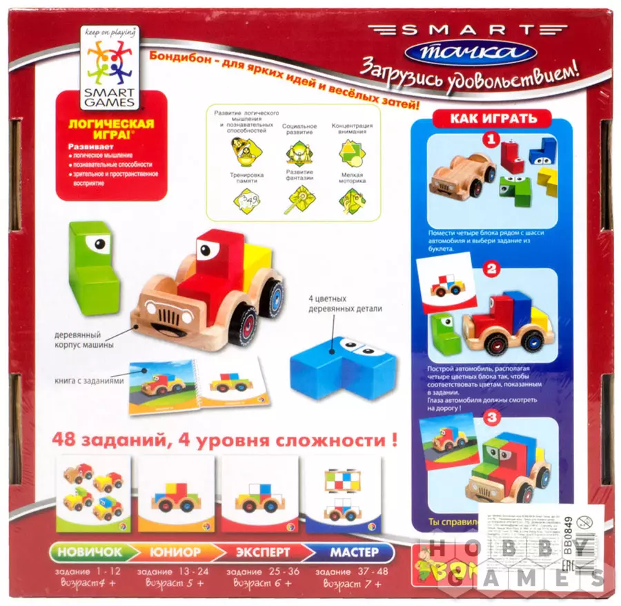 Увлекательная игра для самых юных автомобильных конструкторов. Забавный маленький автомобиль можно собирать и разбирать сколько угодно раз десятками различных способов. Ведь это не только обычная машинка, но и логическая головоломка. Сможет ли малыш сложить все детали кузова так же, как в картинке-задании? При этом на "Смарт Тачке" можно перевозить конфеты, игрушки и разные полезные вещи. Ученые считают, что ребёнок раннего возраста все мыслительные задачи решает руками. Лучший способ помочь ребенку развить моторику рук, мышление, память, фантазию, а также приобрести множество других полезных навыков – это детский конструктор. Настольная логическая игра Smart Тачки - наш вариант безопасного деревянного конструктора без мелких деталей, рекомендованный для малышей от трех лет.