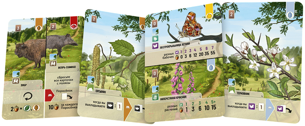 Деревья формируют основу вашего леса – их размещение позволяет заселять обитателей и пополняет поляну новой картой. Обитателей размещайте на свободных местах вокруг деревьев, аккуратно подставляя нужную половину карточки. Каждое удачное размещение приносит очки: животные ценят правильных соседей, растения – определённые деревья, а коллекции грибов и бабочек увеличивают ваш счёт.