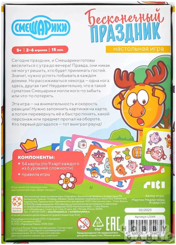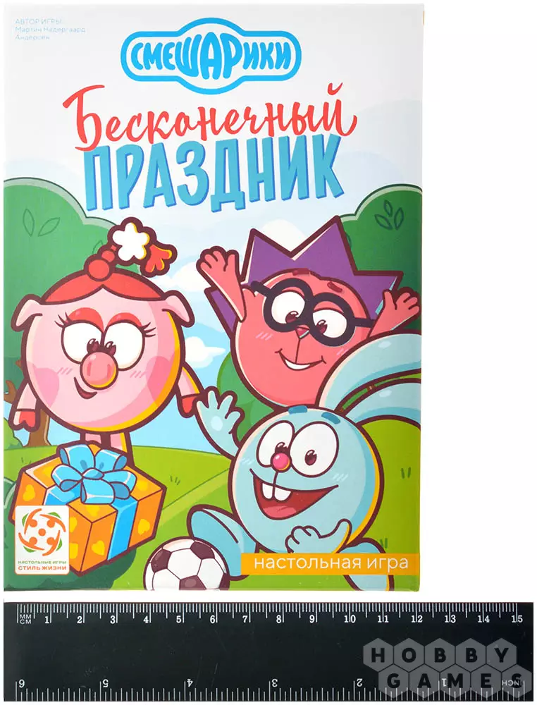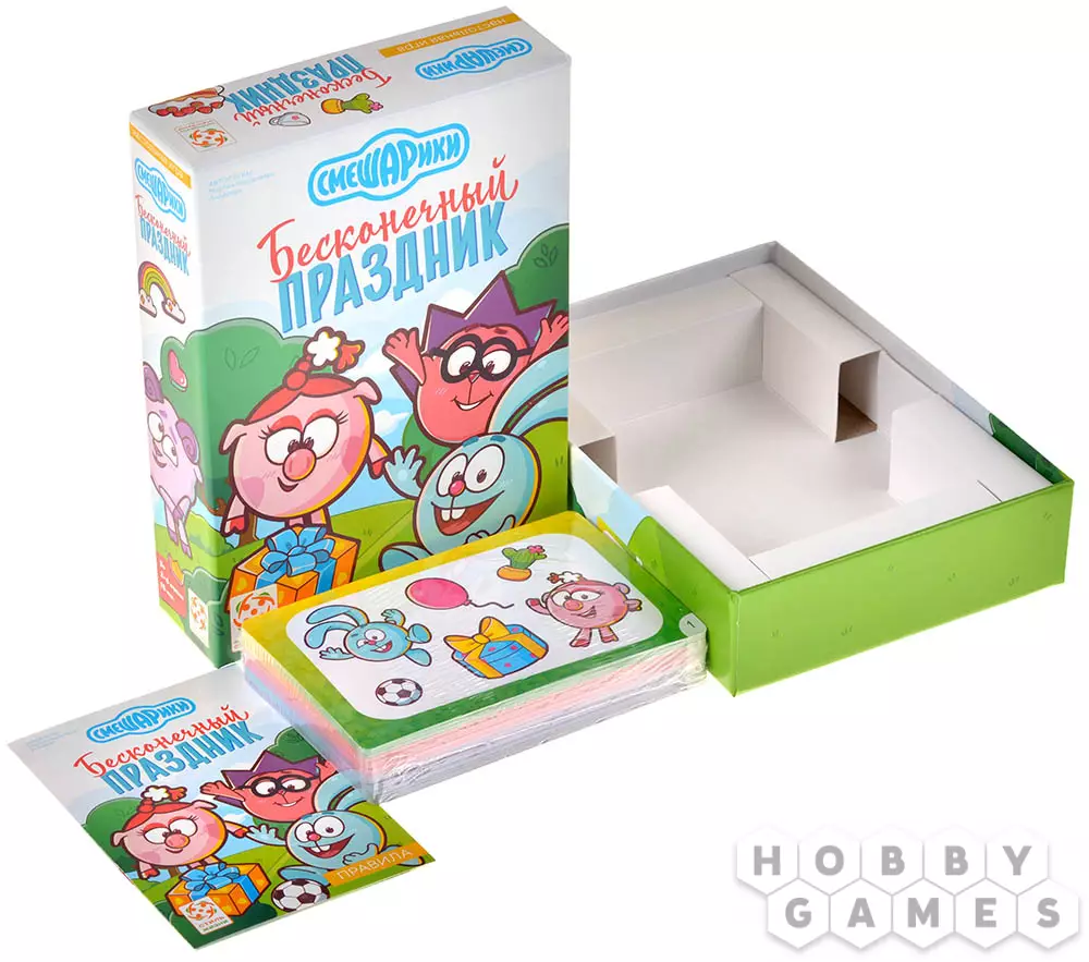 "Смешарики. Бесконечный праздник" – карточная мемори-игра на внимательность и скорость реакции. В центр стола выкладывается колода карт. Игроки внимательно смотрят на верхнюю карту, после чего она переворачивается. Теперь задача участников – как можно быстрее назвать предмет или персонажа, который пропал на обороте карты. В случае правильного ответа игрок получает эту карту в награду.