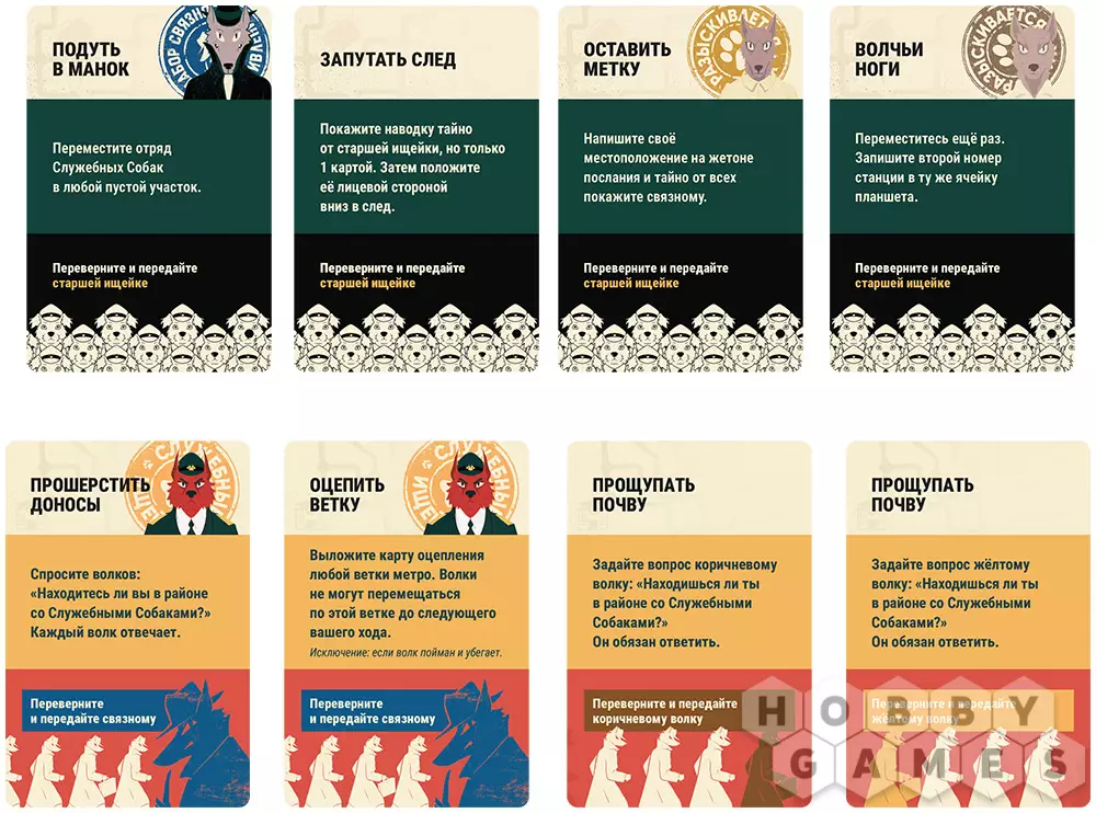 Ход старшей ищейки: Игрок делает до двух перемещений отрядами, но не может перемещаться напрямую между станциями – в этом главная тактическая сложность этой роли! Отряды могут заходить на станции для проверки, но в конце хода автоматически возвращаются в районы. Ищейка может использовать специальные возможности: оцеплять районы и ветки метро, проводить обыски и применять другие оперативные меры.