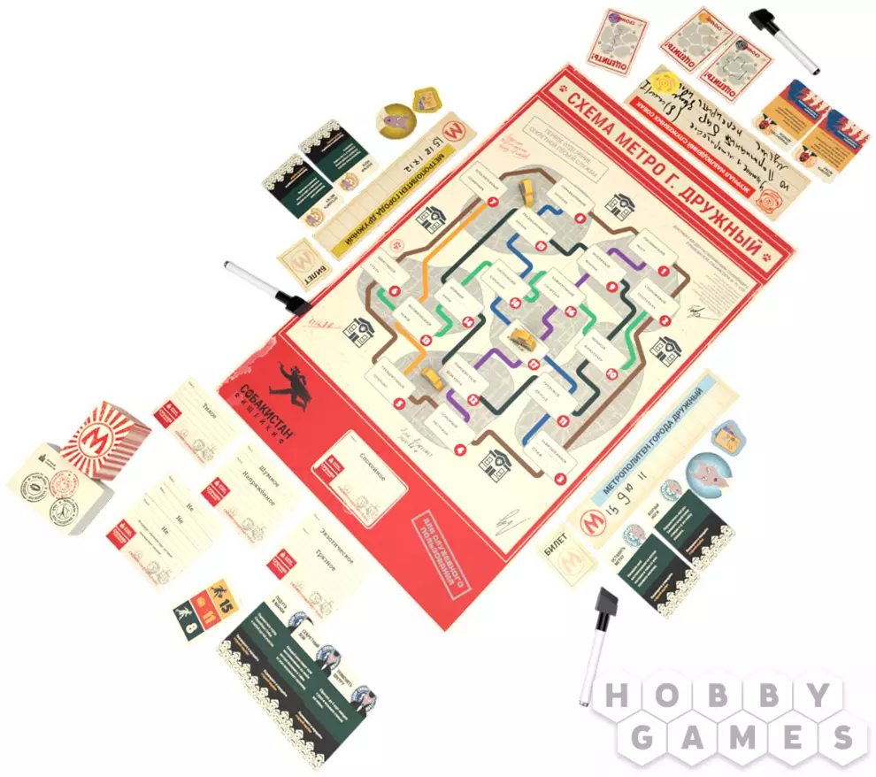 Подготовка начинается с распределения ролей: один игрок становится старшей ищейкой, другой – связным, остальные – волками. Поле собирается из случайных жетонов станций, каждый раз создавая уникальную схему метро. Волки получают планшеты для скрытного перемещения, а ищейка – фигурки отрядов, журнал наблюдений и маркеры.