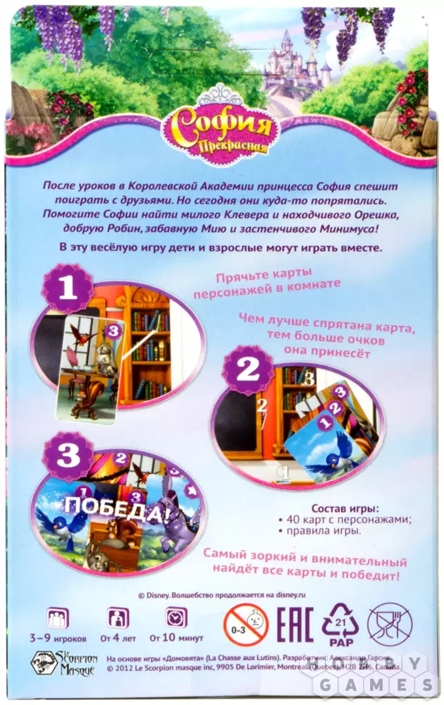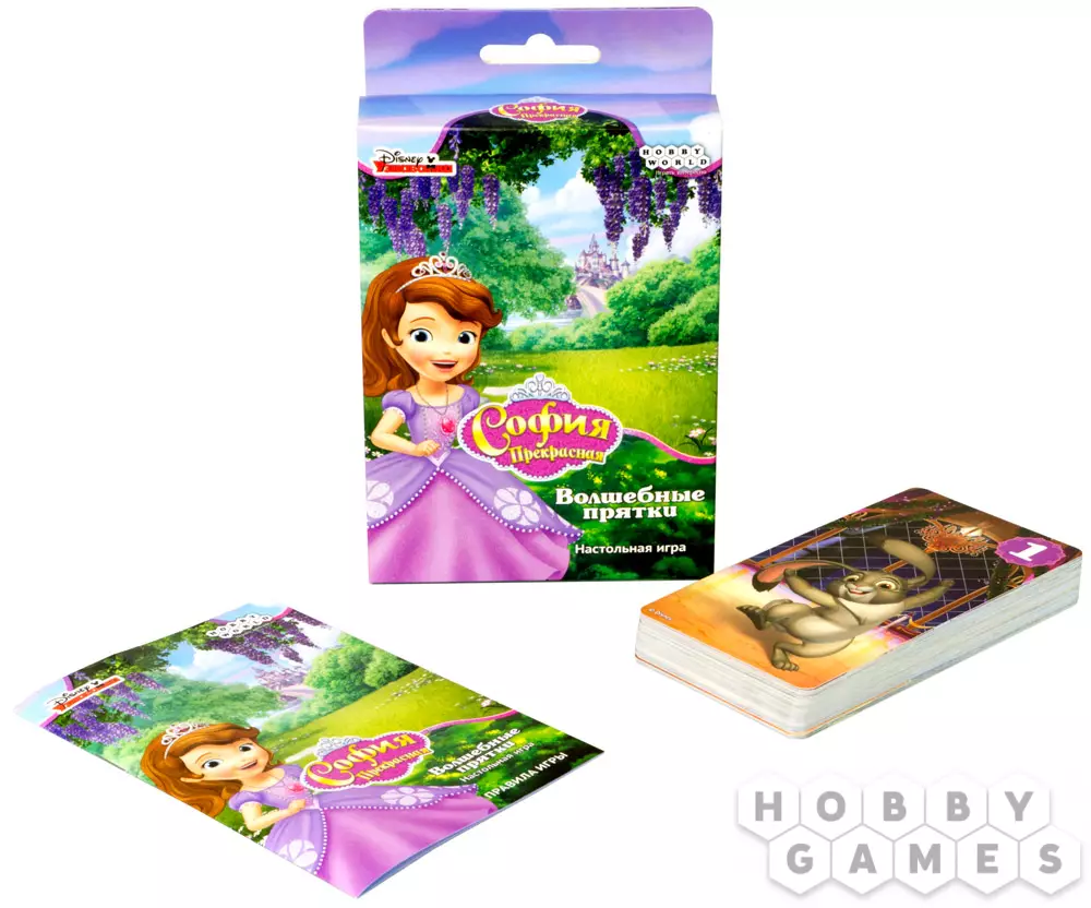 «София Прекрасная. Волшебные Прятки» — это детская настольная игра по мотивам популярного диснеевского мультика, повествующего про жизнь маленькой девочки Софии, которая по счастливой случайности стала настоящей принцессой! В этой игре вам встретятся любимые и знакомые персонажи, приятная рисовка карт, яркий мультяшный дизайн карт и простые правила! По своей сути игра напоминает прятки с участием персонажей из мультика, отлично развивает мышление, при этом является достаточно подвижной, а главное, весёлой игрой!