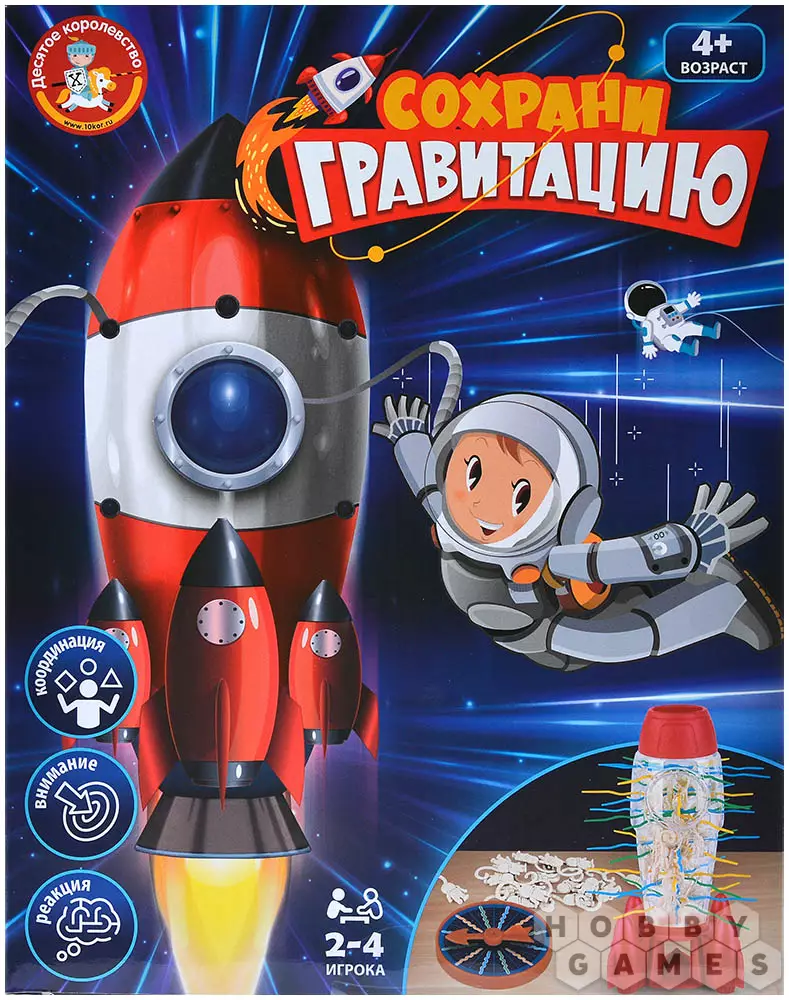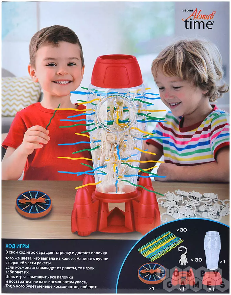 Для начала соберите миниатюру настоящей ракеты и поместите в подготовленные отверстия палочки в произвольном порядке. Затем запустите в неё космонавтов – а их сюда поместится много! Как только будете готовы, начинайте поочерёдно вытаскивать палочки того цвета, который выпадет вам на рулетке, но будьте осторожны: если схватитесь неудачно, несчастные исследователи вселенной не смогут противостоять гравитации и выпадут из ракеты. Ваша задача – избавиться от всех палочек и при этом потерять как можно меньше космонавтов. Ведь каждый выпавший – минус шаг от победы. Победит тот, у кого к концу игры будет меньше всего фигурок. Игра отлично тренирует внимание, координацию и умение оценивать ситуацию.