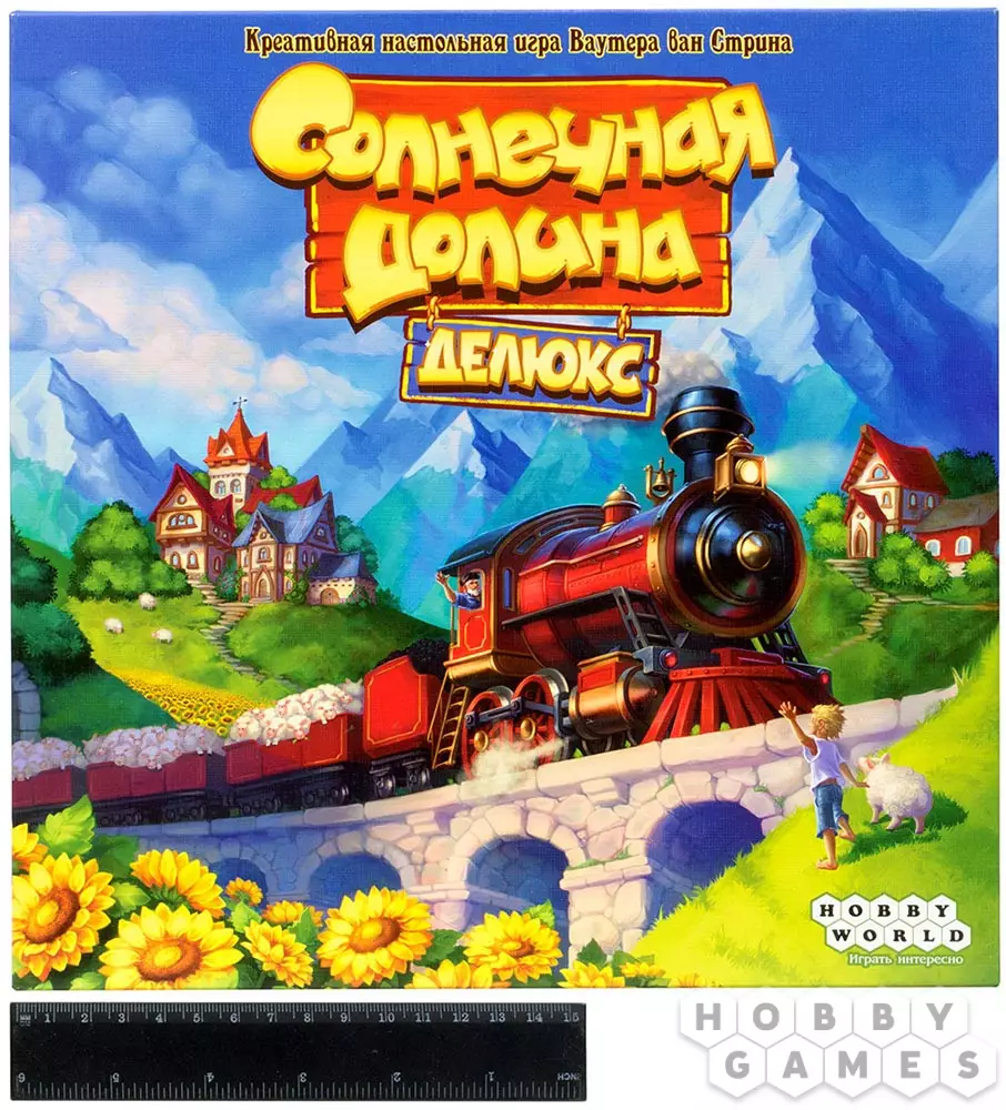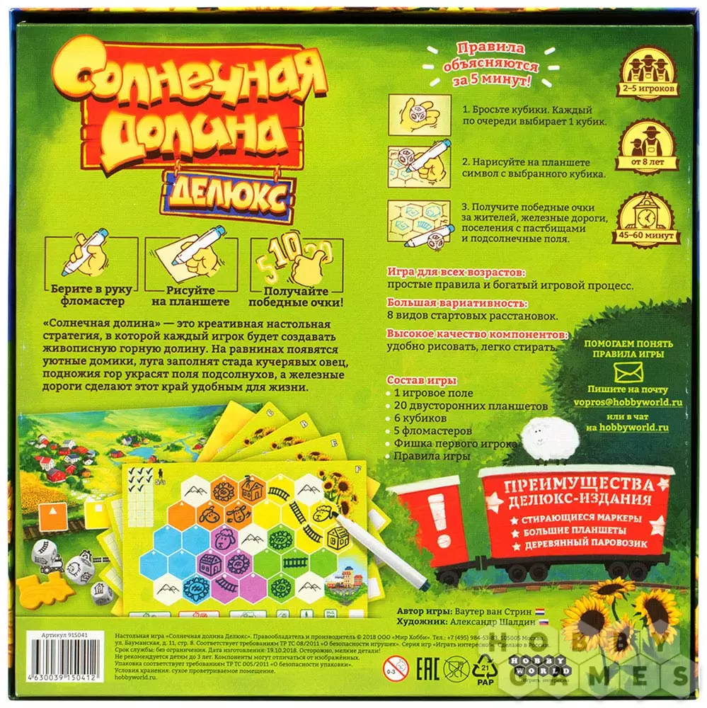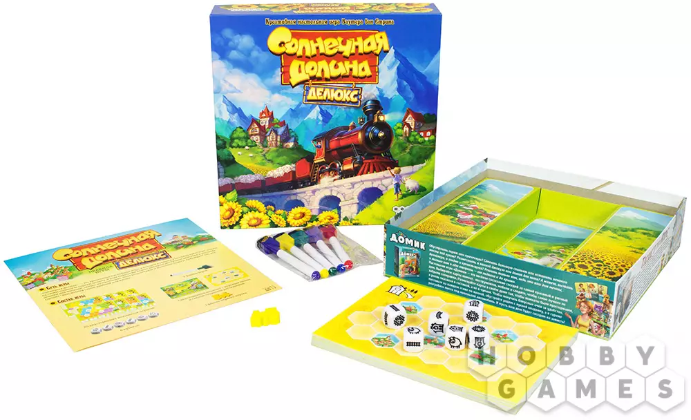 Перед вами делюкс-издание позитивной и яркой настольной игры "Солнечная Долина". Райский уголок стал ещё насыщеннее и комфортнее! Игра не претерпела изменений в механике и остаётся такой же захватывающей и интересной, а сам игровой процесс стал гораздо более комфортным и приятным! Вместо обычных бумажных блокнотов теперь используются удобные двусторонние планшеты, карандаши уступили место клёвым стирающимся фломастерам, а фишка первого игрока превратилась в деревянную модельку поезда!