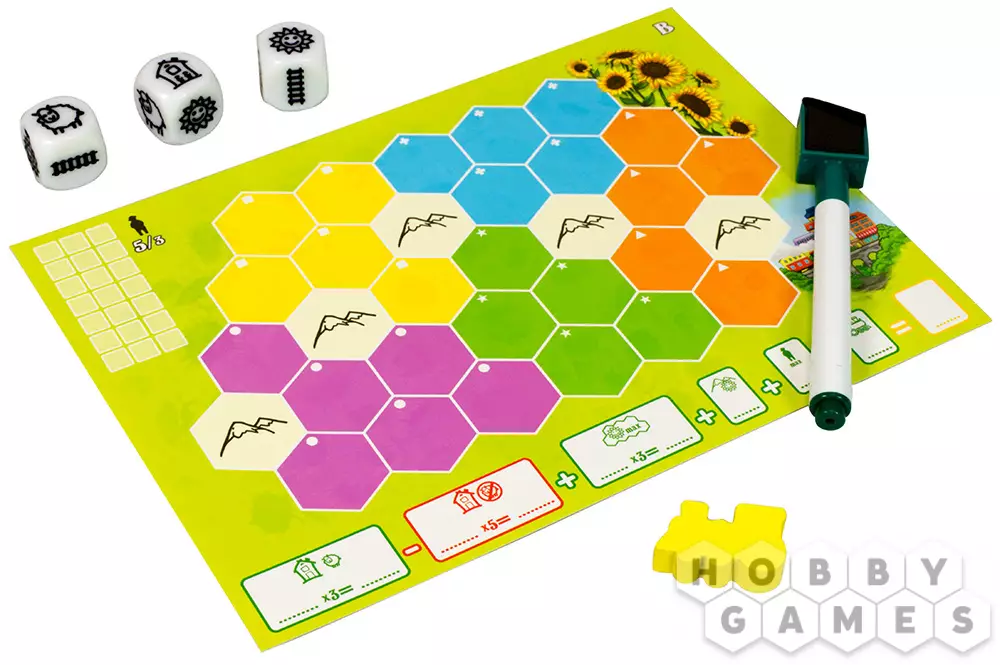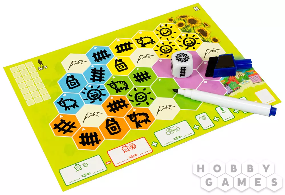 Игра выглядит максимально просто и легка в освоении. У каждого игрока есть свой планшет с гексовым полем, поделённым на участки пяти разных цветов. Каждый раунд ведущий игрок делает бросок шести кубиков, на которых изображены различные игровые объекты. После этого игроки по очереди берут любой кубик с результатом и ставят его на цветную зону игрового поля, определяя таким образом, где им нужно будет нарисовать объект у себя на гексах и одновременно блокируя другим игрокам данный цвет для розыгрыша. На кубике и поле могут быть изображены дома, железные дороги, горы, овцы, подсолнухи и суперподсолнухи. Рисовать их можно, конечно, где угодно, но очки начисляются таким образом: