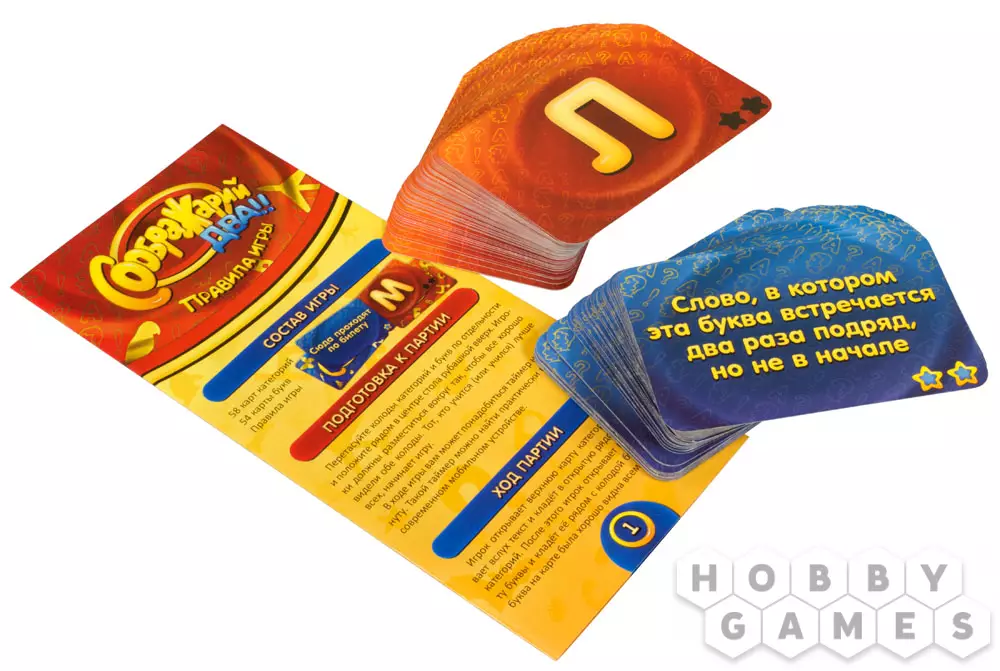 "Соображарий" – это весёлая настольная игра, которая отлично впишется в любую компанию, прекрасно дополнит любой праздник или семейный вечер, а также заставит немного подумать. Развивайте кругозор и словарный запас в увлекательной форме! Простые правила и небольшая коробка позволят брать игру на природу, в кафе или в путешествие. Непродолжительные партии и одновременное участие всех игроков не дадут заскучать! Если же вы, наоборот, хотите устроить настоящий турнир, вы можете объединить "Соображий Два!!" с классическим "Соображарием" и играть, например, до трёх побед.