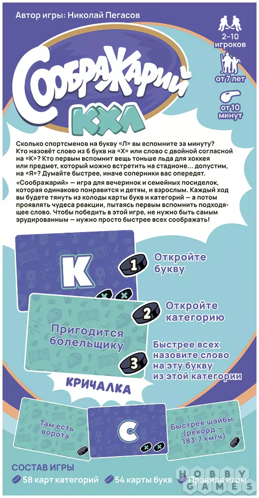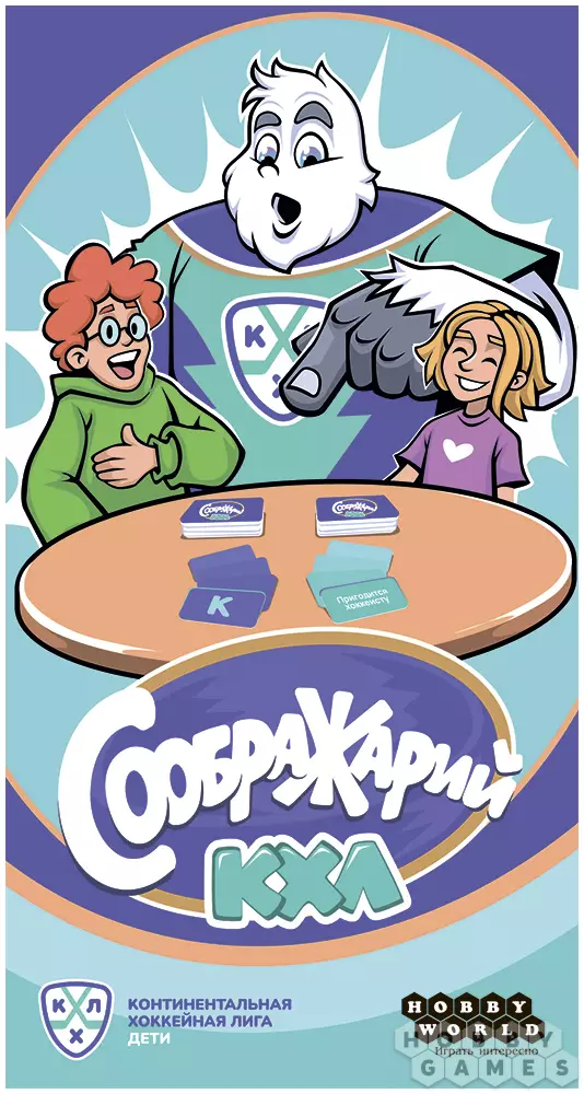 "Соображарий: КХЛ" – настольная игра из популярной серии "Соображарий", тематически посвящённая Континентальной хоккейной лиге. У вас появится уникальная возможность окунуться в мир спорта – быть может, не как спортсмену, но уж точно как фанату, который с не меньшим уважением к этому роду деятельности сможет проявить себя лучшим способом и доказать, что достоин носить звание самого шустро соображающего эксперта. Тяните карты и давайте ответы, выполняя заданные условия, – и не забывайте веселиться!