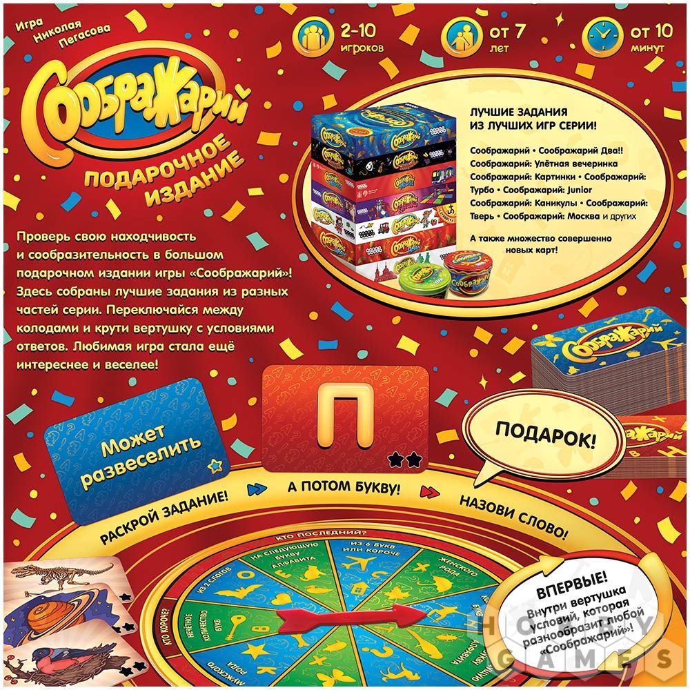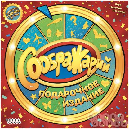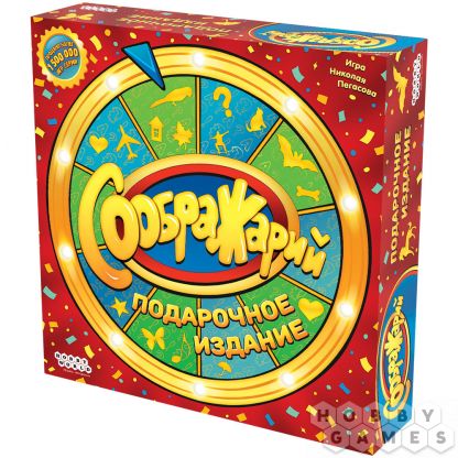 "Соображарий: Подарочное издание" – это коллекция лучших заданий из всей серии культовой игры, собранная в одном наборе. Вы сможете проверить свою находчивость и реакцию в динамичной настолке, где нужно быстрее всех подобрать слово под открытое задание и выпавшую букву.