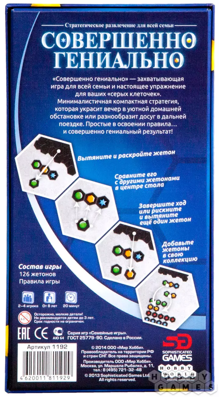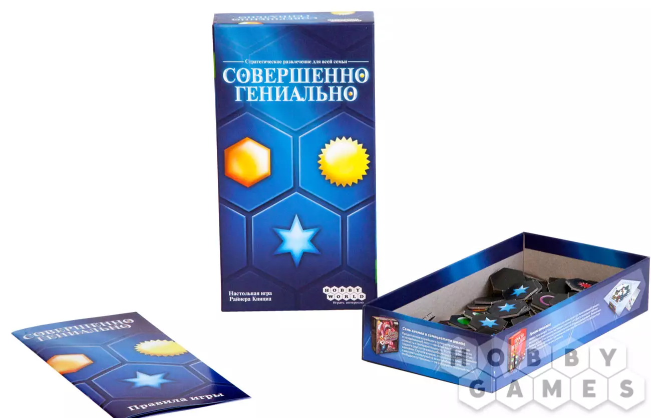 «Совершенно гениально» — захватывающая абстрактная игра на логику и удачу (или жадность!). Каждая партия —настоящее упражнение для мозга. Минималистичная компактная стратегия с простыми правилами подарит немало позитивных эмоций, где вы ни были — дома, на отдыхе или даже в поездке.