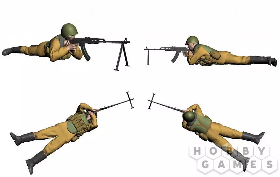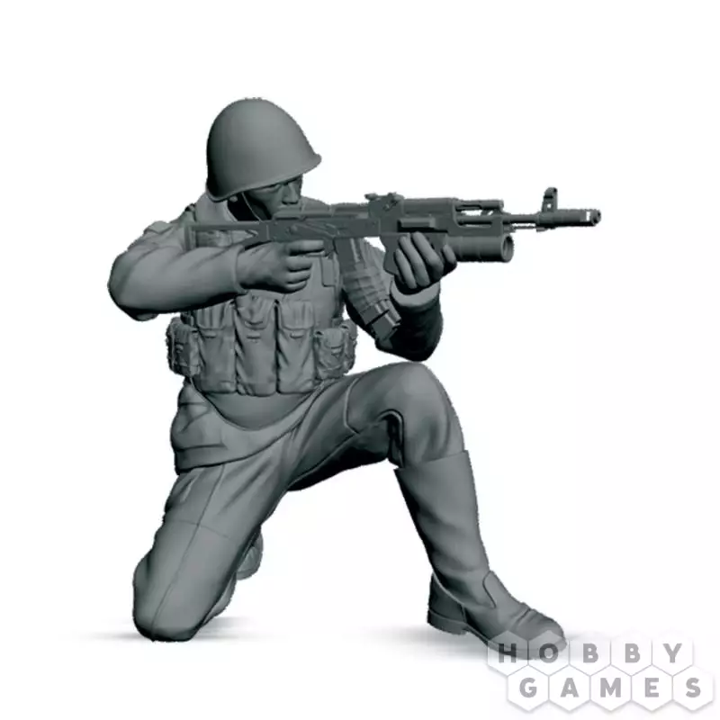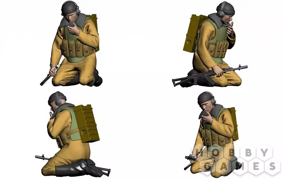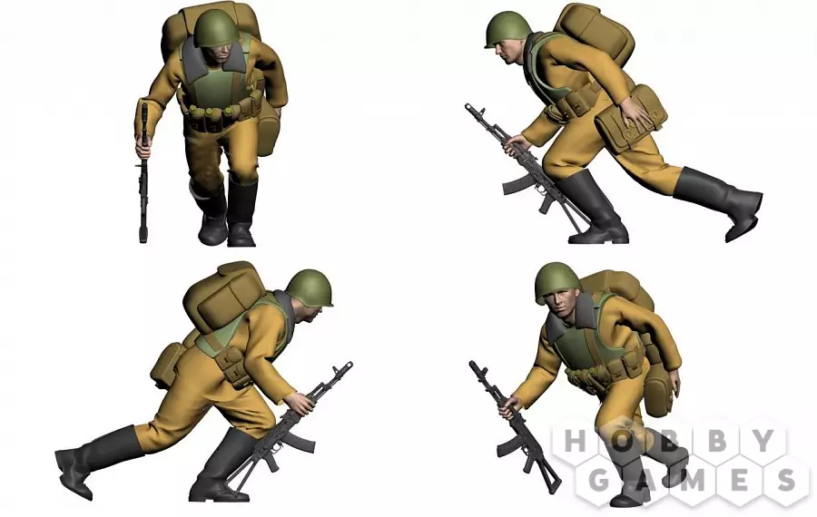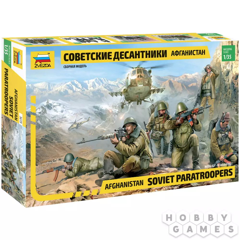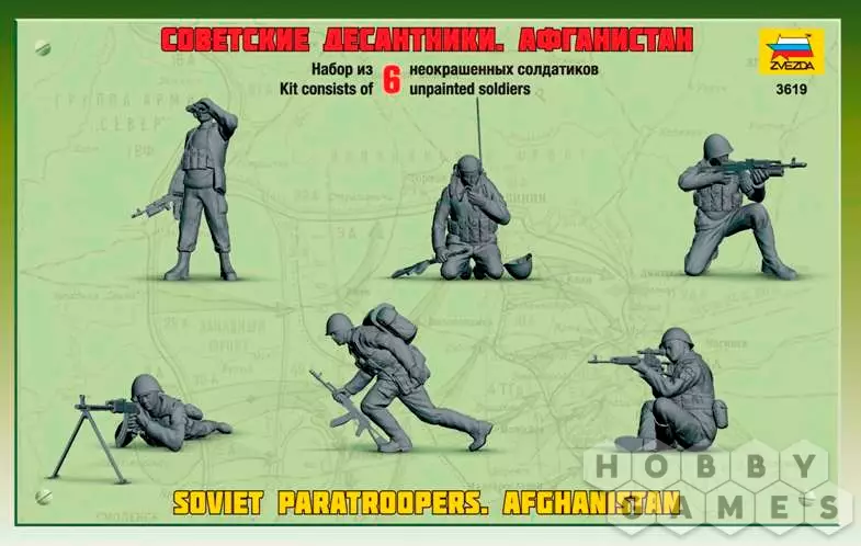 Набор включает 6 фигур советских десантников, изображенных в характерной экипировке для Афганской войны. Каждая фигурка вооружена высокоточными миниатюрами оружия, включая автоматы АК-74, пулемет РПК и снайперскую винтовку Драгунова. Оружие изготовлено с использованием метода высокоточного 3D-моделирования, что позволяет достичь невероятной детализации.
