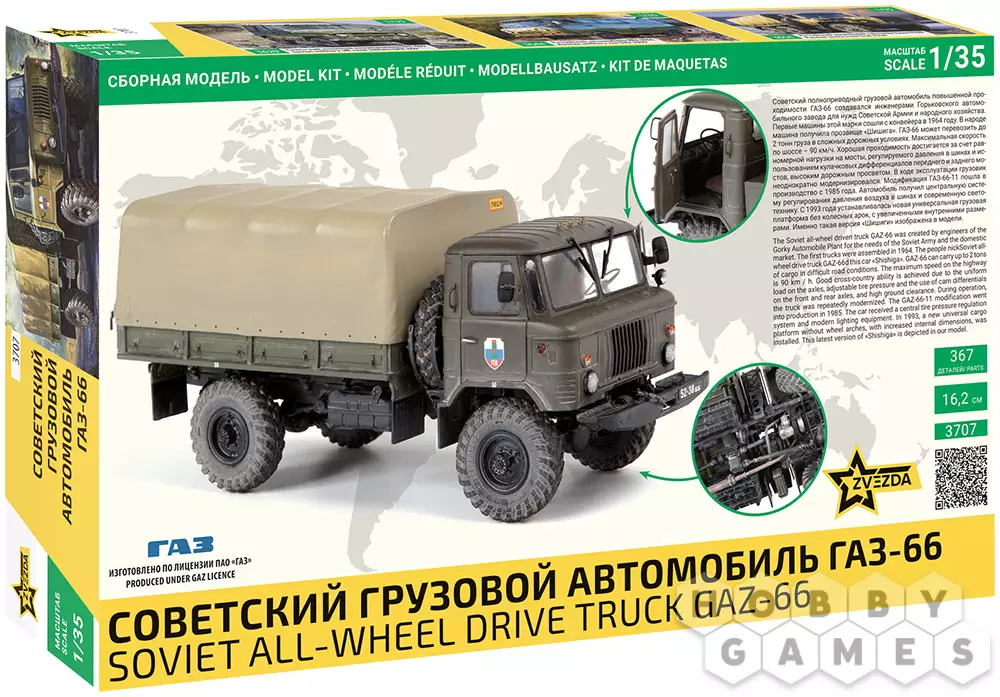 Модель ГАЗ-66-11, поступившая в производство в 1985 году, получила обновлённую систему регулировки давления в шинах и современную светотехнику. В 1993 году автомобиль оснастили новой универсальной грузовой платформой без колесных арок, увеличившей внутреннее пространство. Именно эта модификация легла в основу представленной модели.