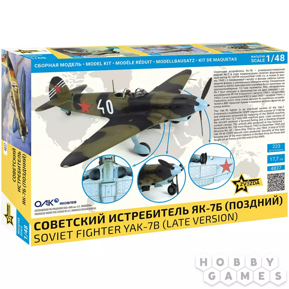 Советский истребитель Як-7Б представляет собой улучшенную модификацию базовой модели Як-7. В процессе модернизации самолёт оснастили более мощным двигателем М-105ПФ, развивающим 1180 лошадиных силы. Кроме того, весной 1943 года машина получила каплевидный фонарь кабины, что значительно улучшило обзор для пилота, и пониженный гаргрот. Вместо синхронных пулемётов ШКАС винтовочного калибра на истребителе установили крупнокалиберные 12,7-мм пулемёты УБС.