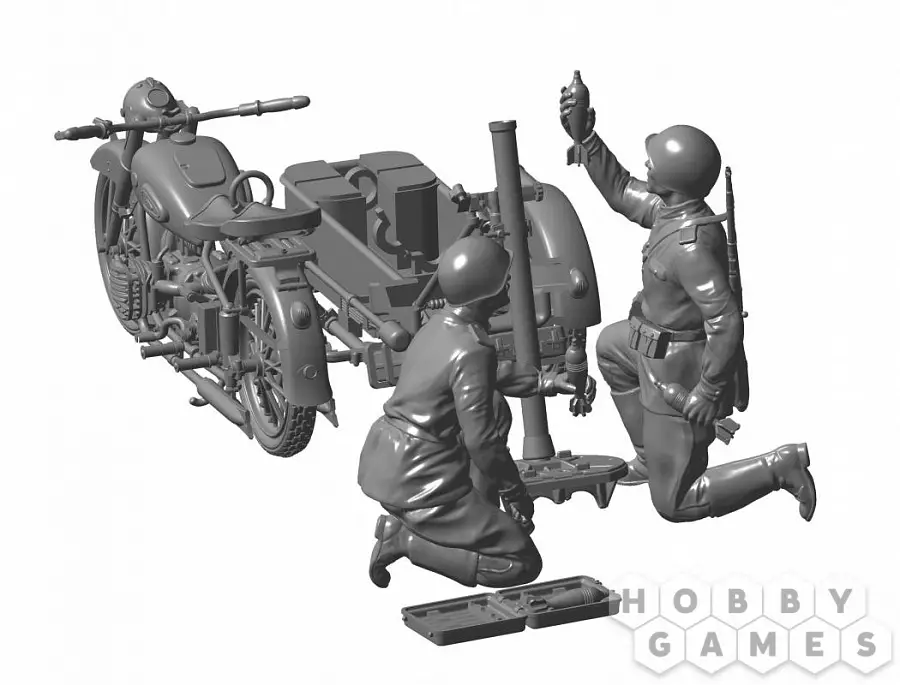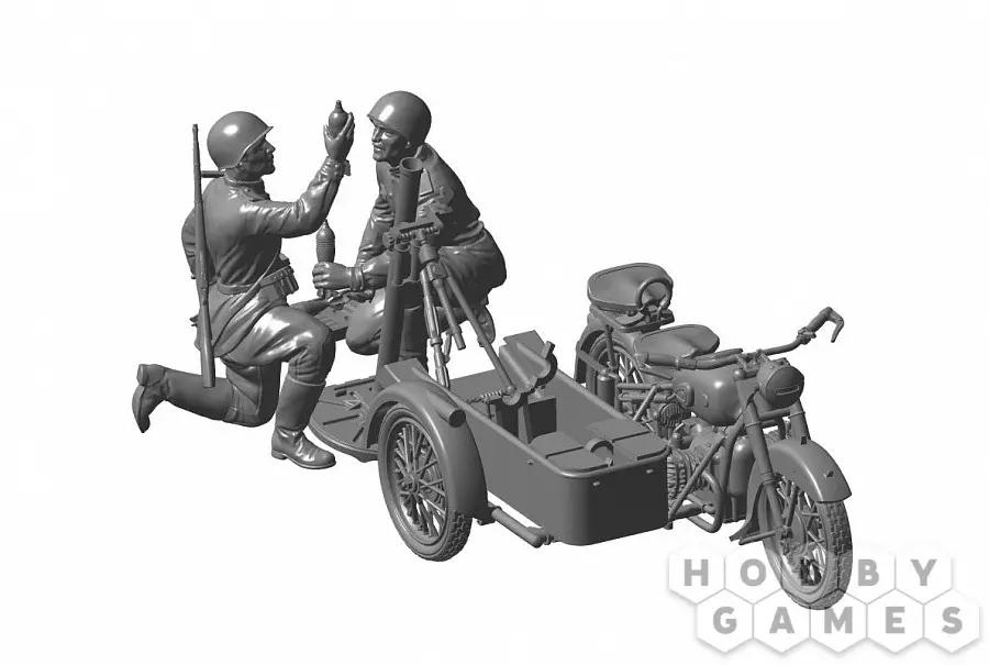Сборная модель включает детали для создания мотоцикла, 82-мм миномета и двух фигур солдат. Вы можете собрать миномет как часть мотоцикла или отдельно.