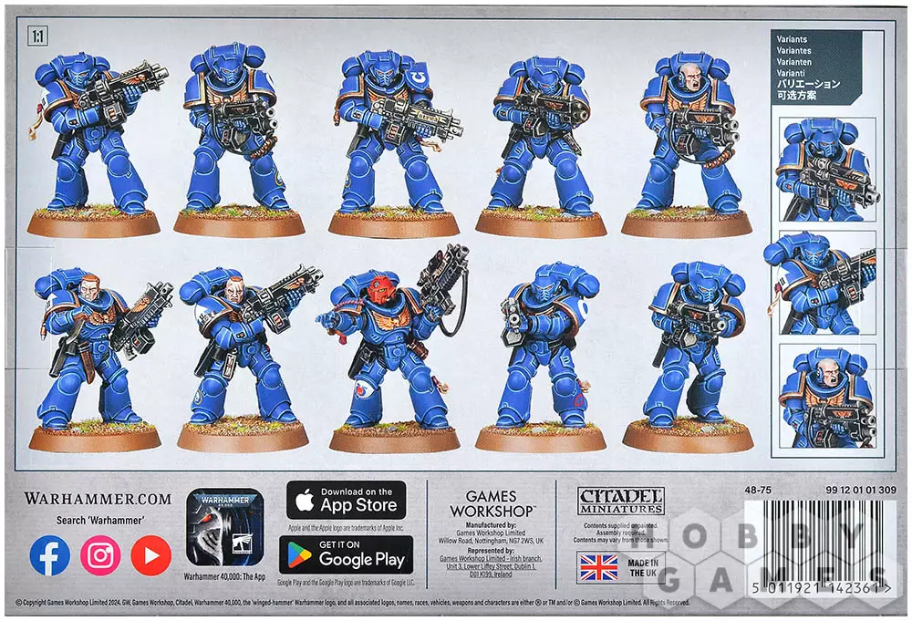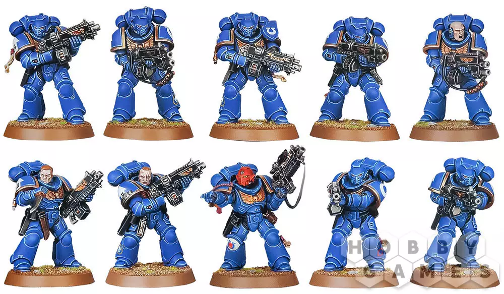 В набор входят все необходимые пластиковые детали для сборки десяти примарисов-заступников. Благодаря прочной броне и подвижности своих доспехов типа "X-Тактикус" и болт-винтовкам, эти космодесантники являются надёжной опорой любой армии. Существуют три типа болт-винтовок: обычная болт-винтовка с серповидным магазином, автоболт-винтовка с зарядником и коробчатым магазином, а также болт-винтовка типа "Ловчий" с лучшим прицелом и прямым магазином. Также в наборе достаточно вариативных деталей рук для экипировки моделей. В их числе: две руки с открытыми радио-передатчиками, две с боевыми ножами, две руки стреляющие из болт-пистолетов и две, поднятые сержантами, приказывающими отделению остановиться. Наконец, в коробке Вы найдёте 24 головы, как открытые, так и скрытые под шлемами.