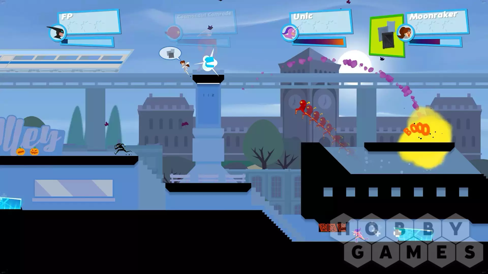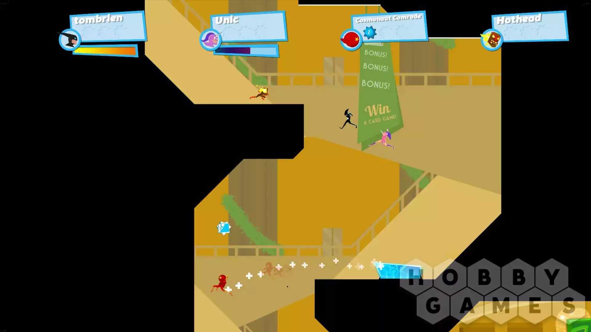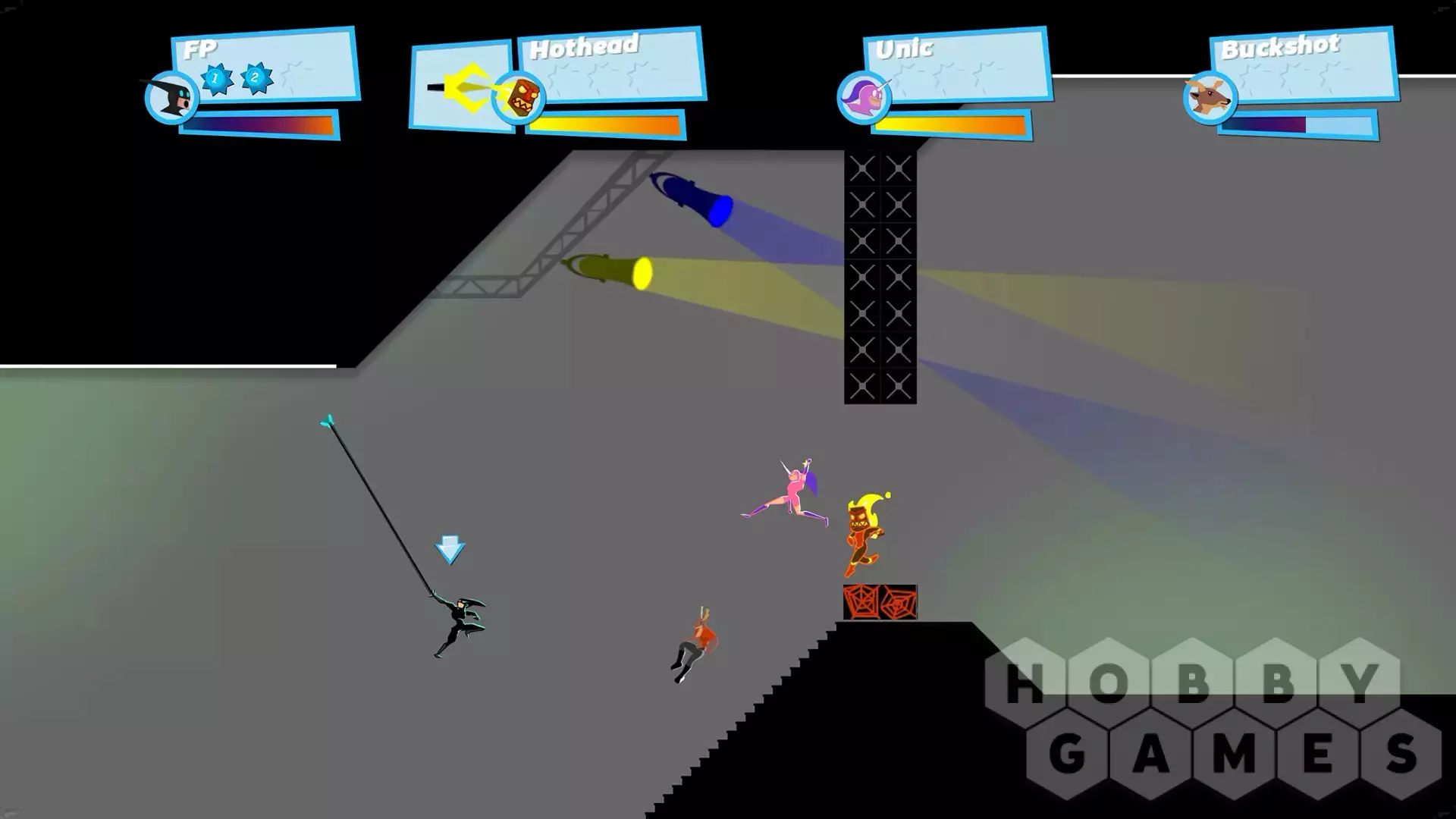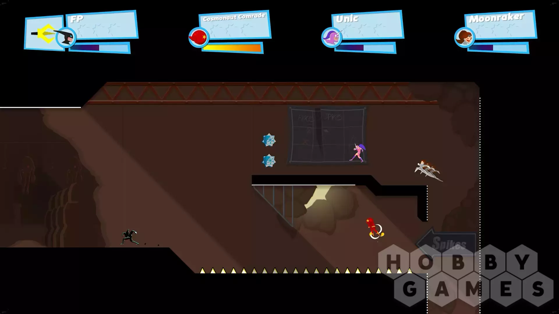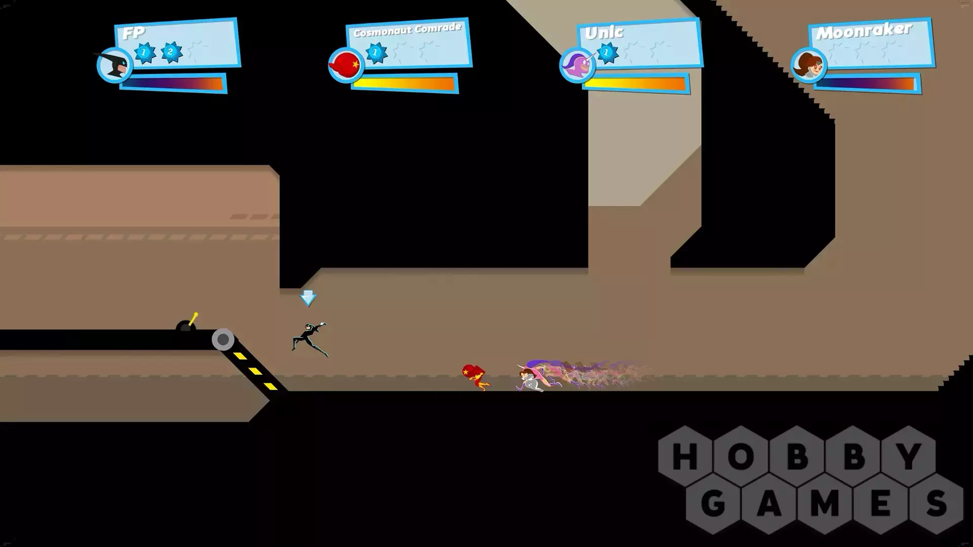 SpeedRunners is a 4 player competitive platformer with grappling hooks, power-ups, and interactive environments. Run, jump, swing around, fire rockets, grapple onto people to knock them off screen.