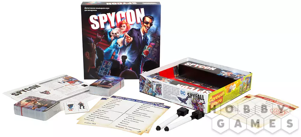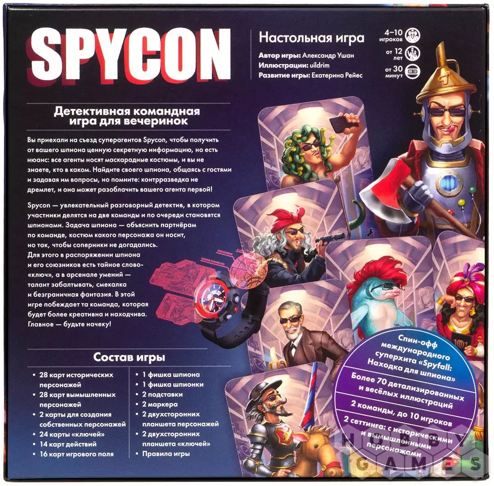 Spycon – это разговорная детективная настольная игра, рассчитанная на противоборство двух команд суперагентов. Игроки по очереди становятся шпионами и каждый пытается объяснить своей команде, в какой именно костюм он облачён. Это нужно делать таким образом, чтобы команда соперников ни о чём не догадалась. Для успешного выполнения этой миссии агенты пользуются тайными словами-ключами, а также проявляют свои таланты шпиона – смекалку, фантазию и артистичность!