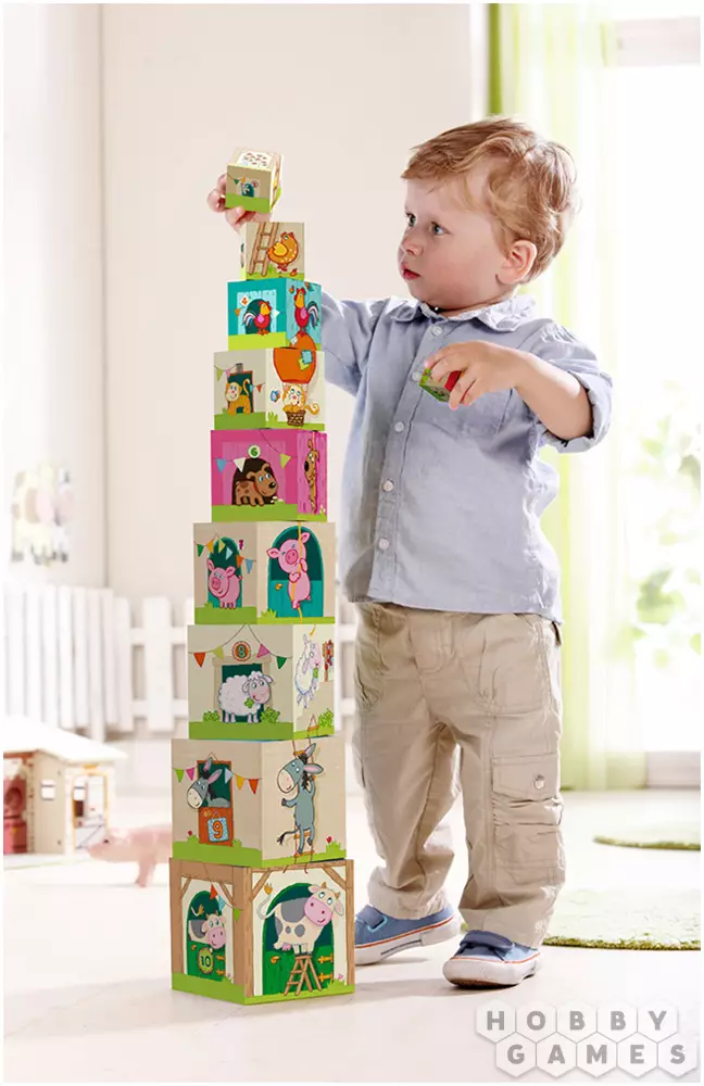 Море солнца и веселья на ферме из кубиков от HABA! На внешних сторонах изображены милые персонажи: фермер Тип, его трактор и, конечно же, животные. С помощью этого набора ваш малыш не только познакомится с цифрами от 1 до 10, он также получит уйму удовольствия, укладывая один кубик на другой снова и снова: построить высокий небоскреб, а потом свалить его на землю! Родители также оценят этот простой набор, ведь он прекрасно убирается, превращаясь в компактную коробочку, которая идеально поместится на книжной полке. Веселье для ребенка как дома, так и вне.