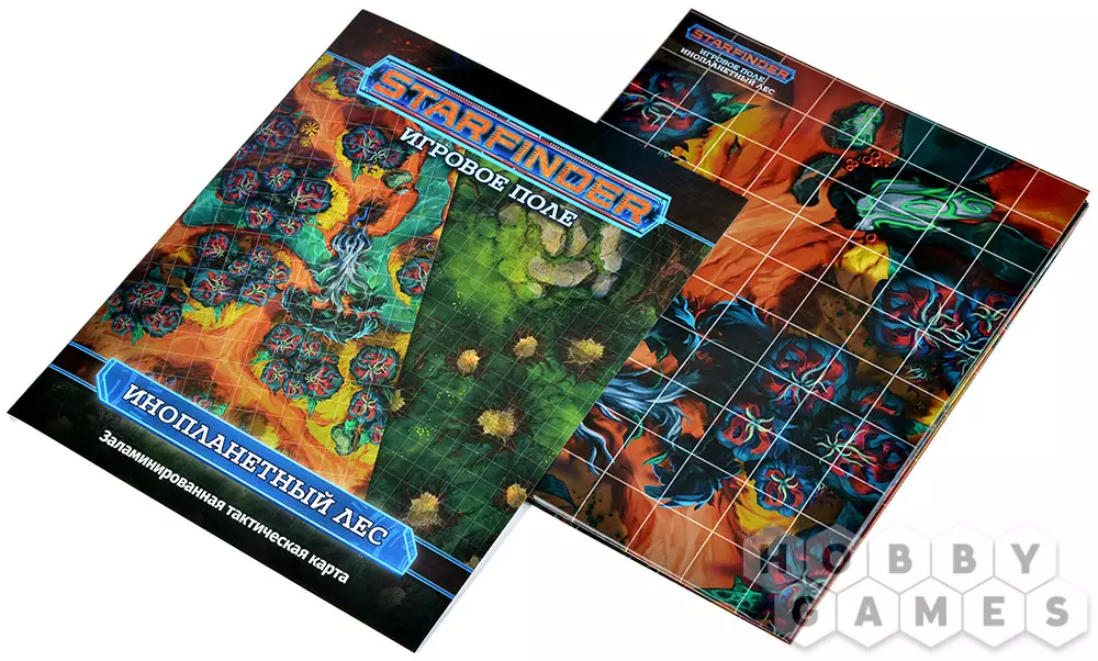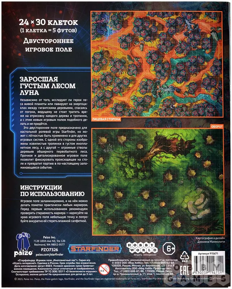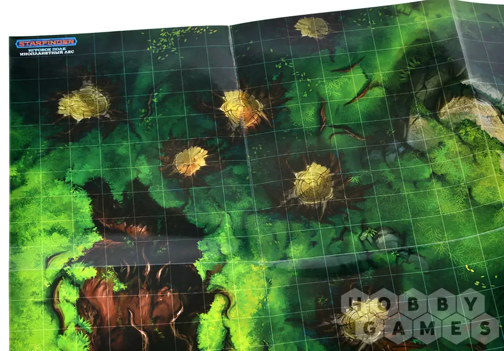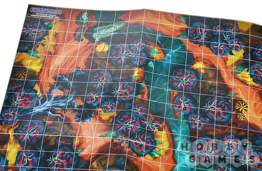 Данное двухстороннее игровое поле "Инопланетный лес" предусмотрено для игры в настольную ролевую игру Starfinder. Однако ничто и никто вам не запрещает использовать её вместе с другими игровыми системами! Одна сторона поля являет вам извилистые тропки, пролегающие сквозь густой лес, а другая – гигантские деревья величественной первобытной чащи.