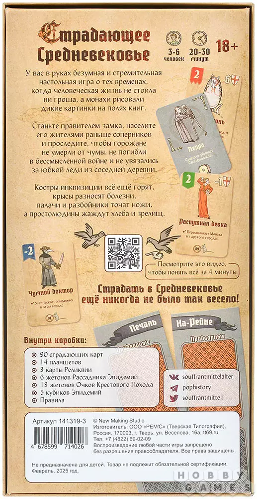Кирилл12.07.2023 04:56Игра забавная, меня как любителя тематики средних веков затянула, особенно атмосферы добавляет то, что все персонажи взяты из реальных средневековых миниатюр картин и моргеналий. Правила простые, единственное, что может оттолкнуть это "обязательность" дополнения "Омерзительное средневековье" без него игра не ощущается полной. А так всем советую, покупайте сразу со всеми домами. -