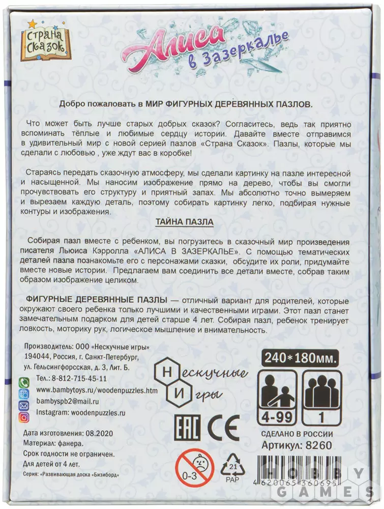 В небольшой коробке из серии "Страна сказок" вы найдёте деревянные элементы, складывающиеся в изображение одной из любимых с детства сказок. Перед вами уникальные пазлы, которые сохраняют естественный запах дерева и сделаны методом прямой экопечати. Фигурные детали делают процесс игры интереснее, так как они, несмотря на то, что являются частью целого, становятся самодостаточными элементами, которые любопытно разглядывать по отдельности.