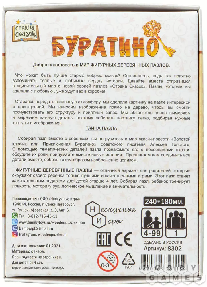 В небольшой коробке из серии "Страна сказок" вы найдёте деревянные элементы, складывающиеся в изображение одной из любимых с детства сказок. Перед вами уникальные пазлы, которые сохраняют естественный запах дерева и сделаны методом прямой экопечати. Фигурные детали делают процесс игры интереснее, так как они, несмотря на то, что являются частью целого, становятся самодостаточными элементами, которые любопытно разглядывать по отдельности.