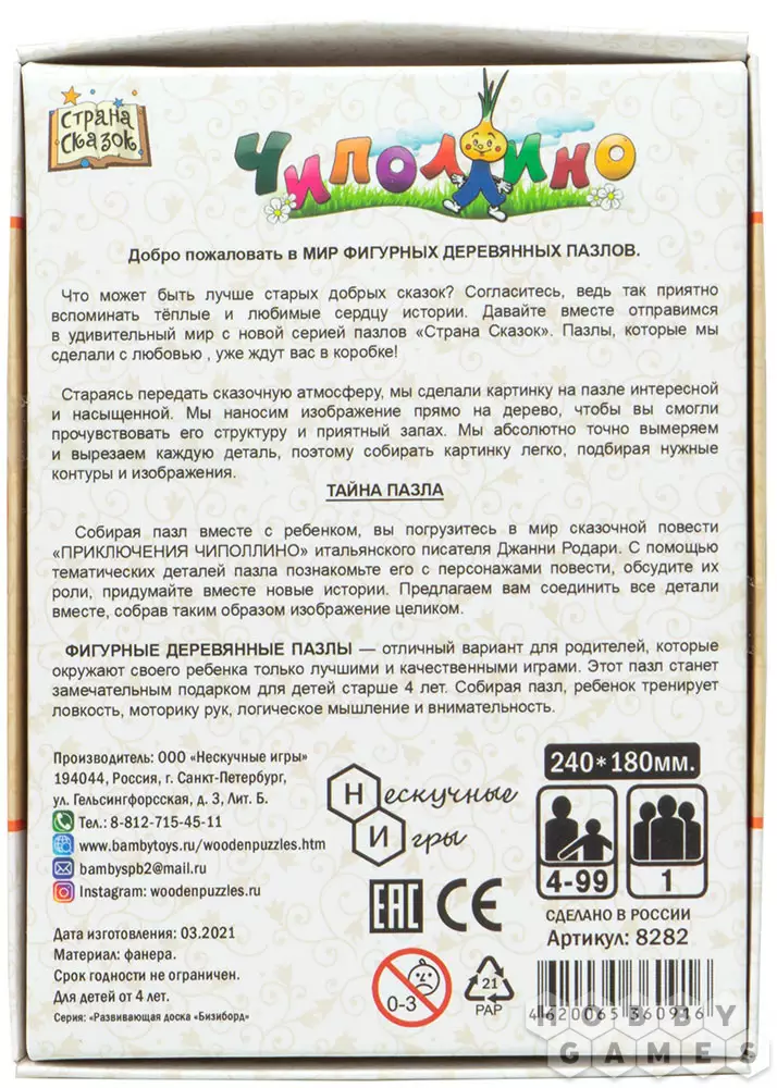 В небольшой коробке из серии "Страна сказок" вы найдёте деревянные элементы, складывающиеся в изображение одной из любимых с детства сказок. Перед вами уникальные пазлы, которые сохраняют естественный запах дерева и сделаны методом прямой экопечати. Фигурные детали делают процесс игры интереснее, так как они, несмотря на то, что являются частью целого, становятся самодостаточными элементами, которые любопытно разглядывать по отдельности.