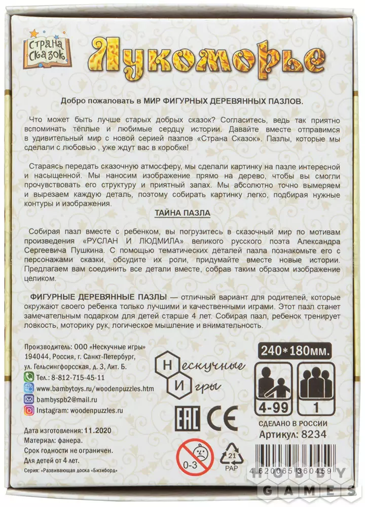 В небольшой коробке из серии "Страна сказок" вы найдёте деревянные элементы, складывающиеся в изображение одной из любимых с детства сказок. Перед вами уникальные пазлы, которые сохраняют естественный запах дерева и сделаны методом прямой экопечати. Фигурные детали делают процесс игры интереснее, так как они, несмотря на то, что являются частью целого, становятся самодостаточными элементами, которые любопытно разглядывать по отдельности.