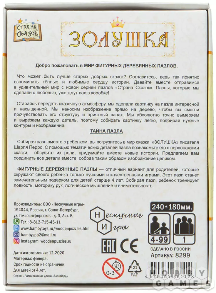 В небольшой коробке из серии "Страна сказок" вы найдёте деревянные элементы, складывающиеся в изображение одной из любимых с детства сказок. Перед вами уникальные пазлы, которые сохраняют естественный запах дерева и сделаны методом прямой экопечати. Фигурные детали делают процесс игры интереснее, так как они, несмотря на то, что являются частью целого, становятся самодостаточными элементами, которые любопытно разглядывать по отдельности.