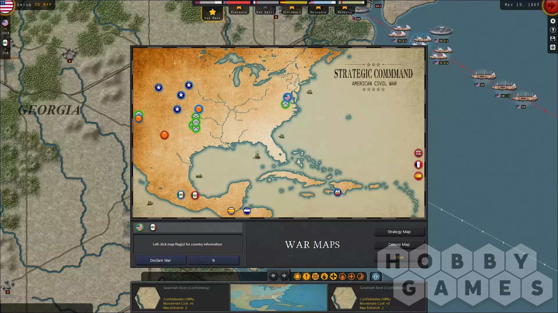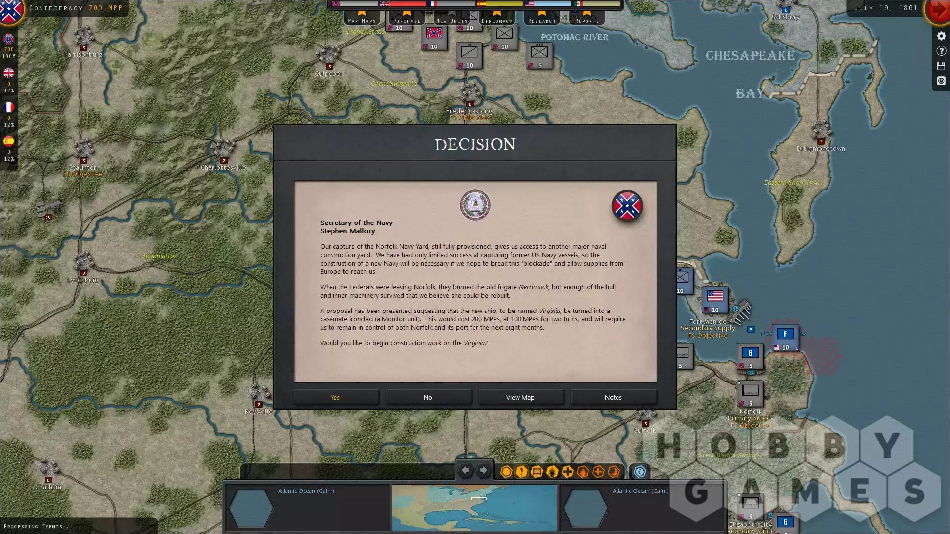 Дипломатические действия, успех на поле боя и такие события, как продажа запасов хлопка Конфедерации или прокламация об эмансипации, определят, вмешаются ли европейские великие державы в Гражданскую войну. Великобританию, Францию и Испанию можно убедить поддержать дело Конфедерации, и их вмешательство может значительно изменить исход войны.