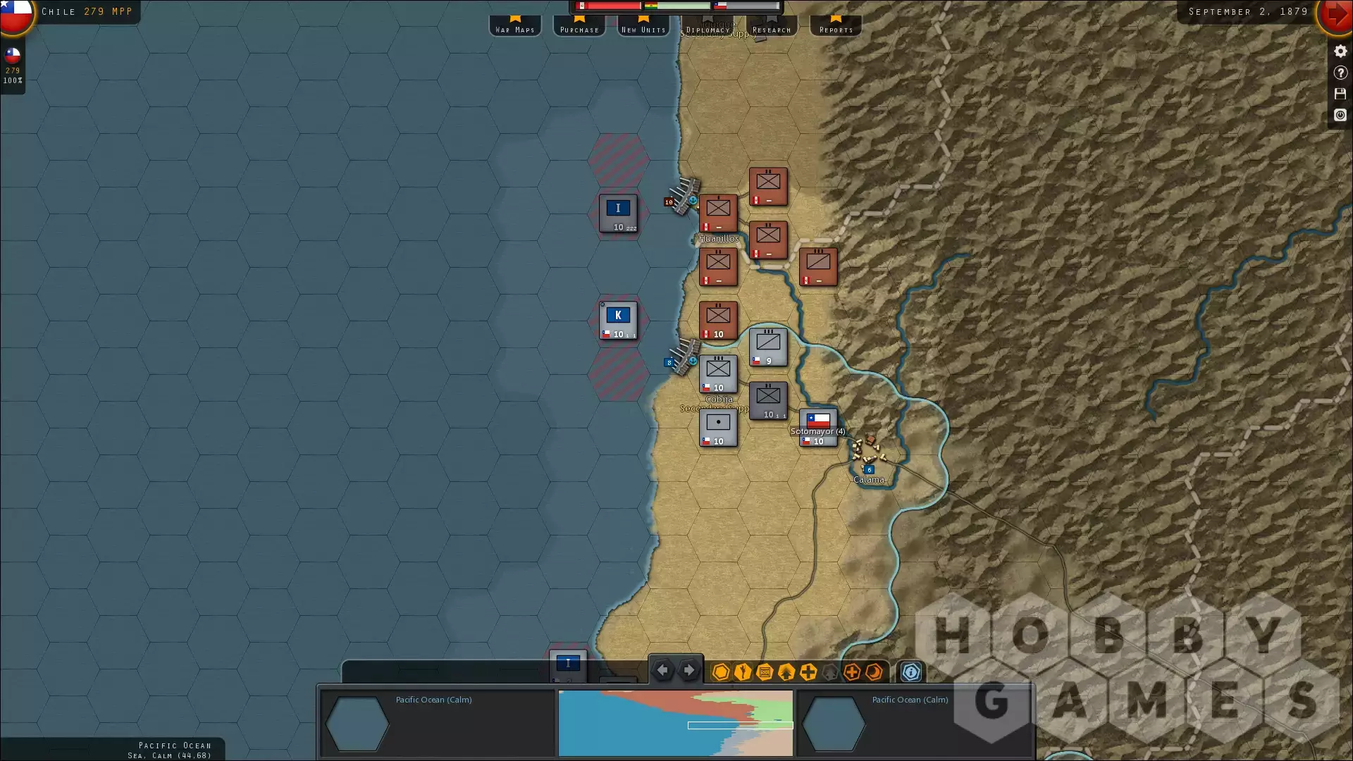 В течение шести месяцев в 1879 году перуанский броненосец "Уаскар" под командованием талантливого адмирала Грау противостоял попыткам Чили захватить богатые селитрой и медью рудники пустыни Атакама. В серии дерзких рейдов Huascar потопил чилийские военные корабли и захватил ее транспорты, и в конечном итоге потребовался весь чилийский флот, чтобы окончательно победить "призрак Тихого океана" в битве при Ангамосе. В этой кампании вы возьмете на себя командование Чили или Перу во время драматических сражений с броненосцами и смелых высадок десанта в эпическом южноамериканском конфликте. Сможете ли вы победить в Тихоокеанской войне?