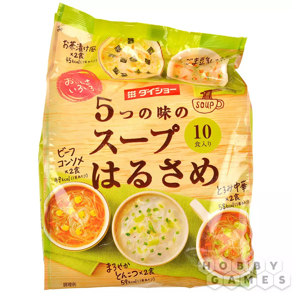 Цените вкусную, разнообразную и полезную пищу, но нет времени на готовку? Суп Daisho идеально вам подойдёт! Блюдо придётся по вкусу любителям азиатской кухни, оно идеально сочетает в себе мелко нарезанную лапшичку и другие ингридиенты. Особенность супа в его необычном богатом вкусе и пряном насыщенном аромате! Вдобавок на каждой упаковке указано точное количество калорий, не достигающее 60. Всего в пачке 10 порций и 5 вкусов,откройте одну из них, заливайте кипятком и сытный обед готов!