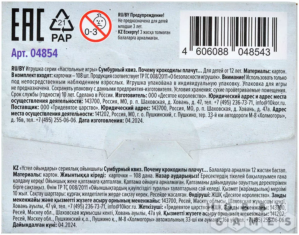 "Почему крокодилы плачут?" – спросите вы. И ответите тоже вы, ведь в этом и заключается смысл этой развивающей игры! Вы будете по очереди тянуть карточки, на каждой из которых написан вопрос и приведены три варианта объяснения. Ваша задача – выбрать верный ответ. Проверить себя просто: переверните карту и огласите написанное на обороте. Если вы угадали, заберите её себе. Настоящим эрудитом станет тот, кто к концу приобретёт самую толстую колоду с честно отгаданными вопросами! А самое приятное, побороться за это звание можно как вдвоём с другом, так и в большой компании!