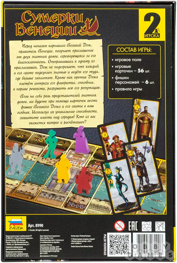 Историю дополняет любовная линия, где ревнивая дама сердца, владеющая многими тайнами Дожа, пытается навредить его репутации. В дуэльной игре "Сумерки Венеции" вы становитесь одним из представителей знатного дома, который при помощи хитросплетений ведёт правителя в один из особняков по игровому полю. Маршрут вашего пути может измениться в любой момент. Будьте пронырливее и остерегайтесь коварных фавориток!