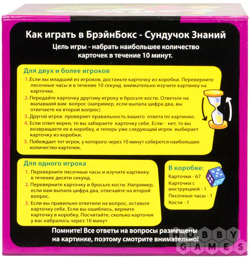 Серия настольных игр "Сундучок знаний" рассчитана на обучение детей в весёлой игровой форме. Эти игры развивают внимательность и наблюдательность, предлагая участникам изучить картинку в течение десяти секунд, а потом ответить на определённый вопрос. Каждая коробочка с игрой содержит несколько десятков карточек, объединённых одной тематикой. Таким образом, ребёнок, изучая карточки, усваивает полезную информацию по тому или иному предмету и узнаёт много нового и интересного.