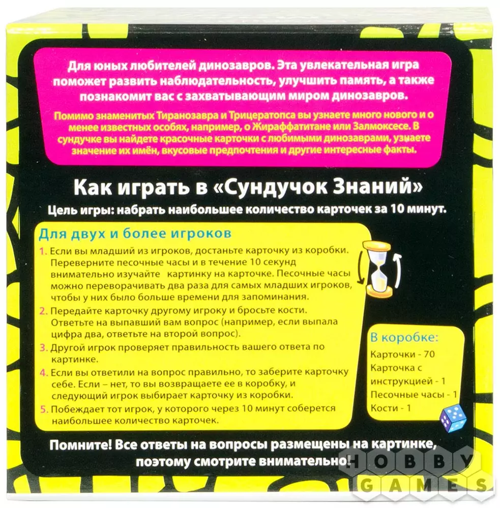А вы знали, что "Спинозавр" означает "шипастый ящер"? А что Анкилозавр по размеру и форме был похож на танк? А ещё, например, у Пситтакозавра был клюв, но не было зубов, а его название означает "ящерица-попугай"! Множество интересных фактов и каверзных вопросов ждут вас в настольной игре "Сундучок знаний "Мир динозавров".