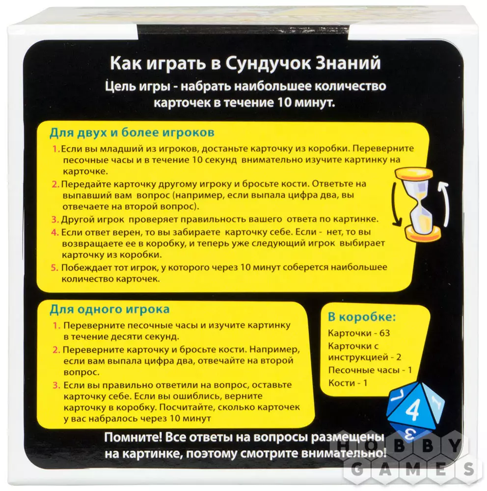 Серия настольных игр "Сундучок знаний" рассчитана на обучение детей в весёлой игровой форме. Эти игры развивают внимательность и наблюдательность, предлагая участникам изучить картинку в течение десяти секунд, а потом ответить на определённый вопрос. Каждая коробочка с игрой содержит несколько десятков карточек, объединённых одной тематикой. Таким образом, ребёнок, изучая карточки, усваивает полезную информацию по тому или иному предмету и узнаёт много нового и интересного.